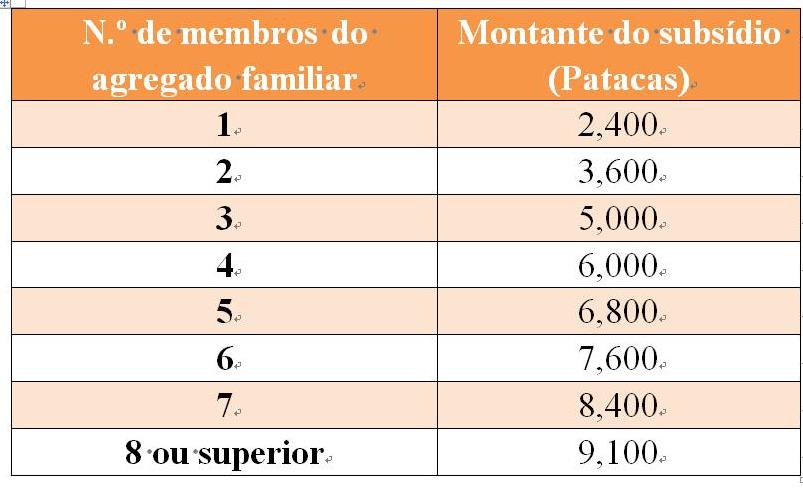 Desde 2003, o Governo da RAEM, através do Projecto de Concessão do Subsídio Especial para a Manutenção de Vida, tem atribuído duas vezes por ano, o subsídio especial para a manutenção de vida de prestação única, aos três tipos de famílias em situação vulnerável (famílias monoparentais, famílias com doentes crónicos ou com deficientes) que são beneficiárias do apoio económico regular, ou cujo rendimento não ultrapassa um múltiplo determinado (1,8 vez para este ano) do valor do risco social. Com o aumento em Janeiro deste ano do valor do risco social, proceder-se-á também a um aumento no montante do subsídio em causa para os três tipos de famílias em situação vulnerável (vide a mapa seguinte)