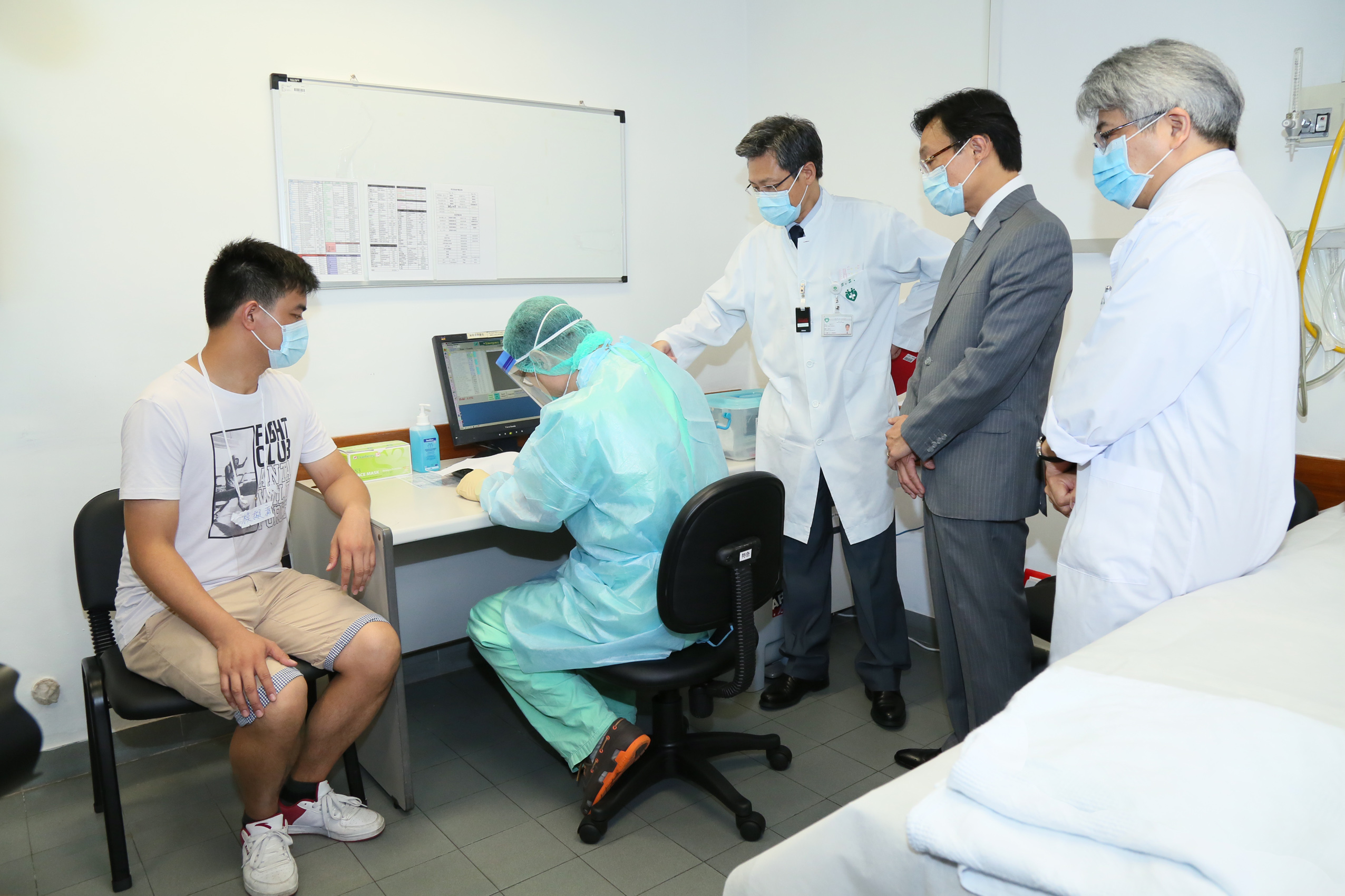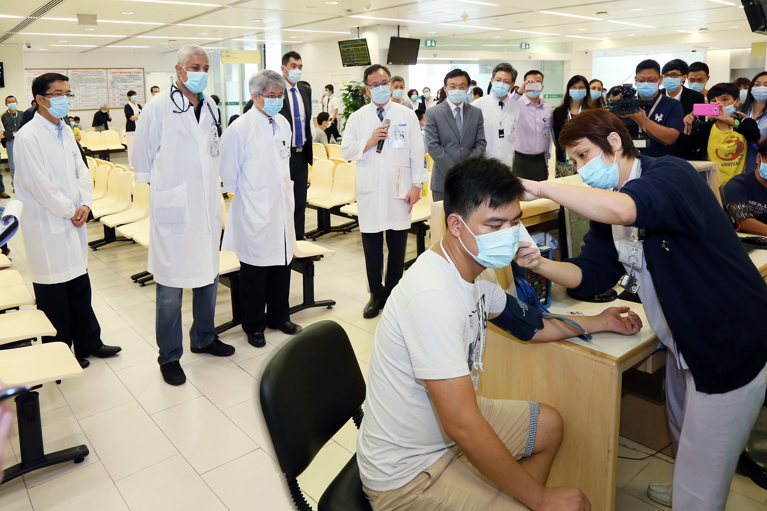 Para testar a capacidade da instituição médica na detecção precoce dos casos, isolamento, controlo de infecção e outras medidas preventivas, assim como o tratamento de emergência que possa surgir durante os procedimentos no caso de um doente suspeito de Mers recorrer à consulta médica no Centro Hospitalar Conde de São Januário, foi realizado na manhã desta sexta-feira, 5 de Junho, um simulacro de contingência do sindrome respiratória do Médio Oriente – Mers. Estiveram presentes como observadores durante todo o procedimento do simulacro o Secretário para os Assuntos Sociais e Cultura, Dr. Alex Tam, o Director dos Serviços de Saúde, Dr. Lei Chin Ion, o Director do CHCSJ, Dr. Kuok Cheong U e o Responsável do Serviço de Urgência, Dr,. Lei Wai Seng.