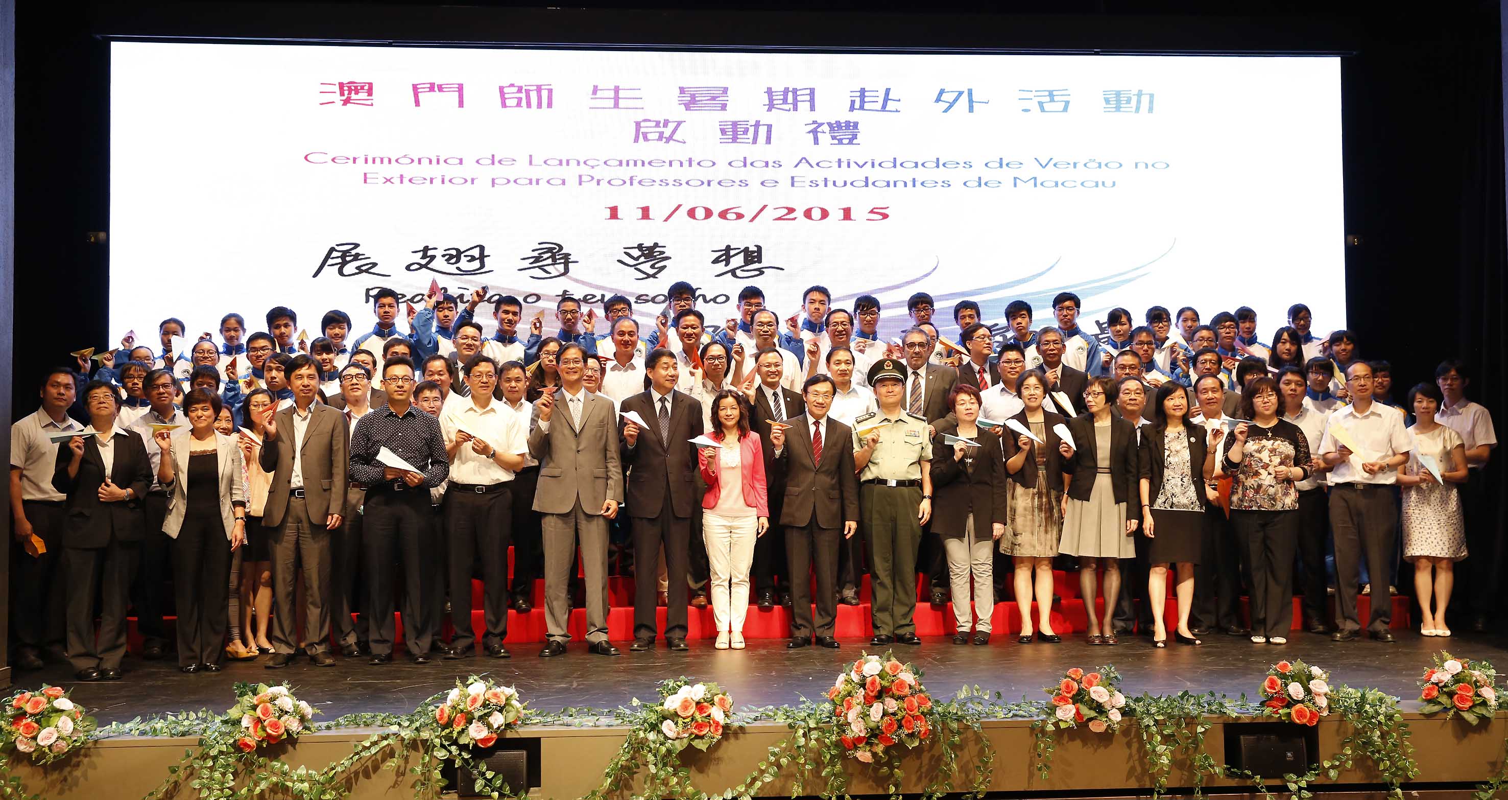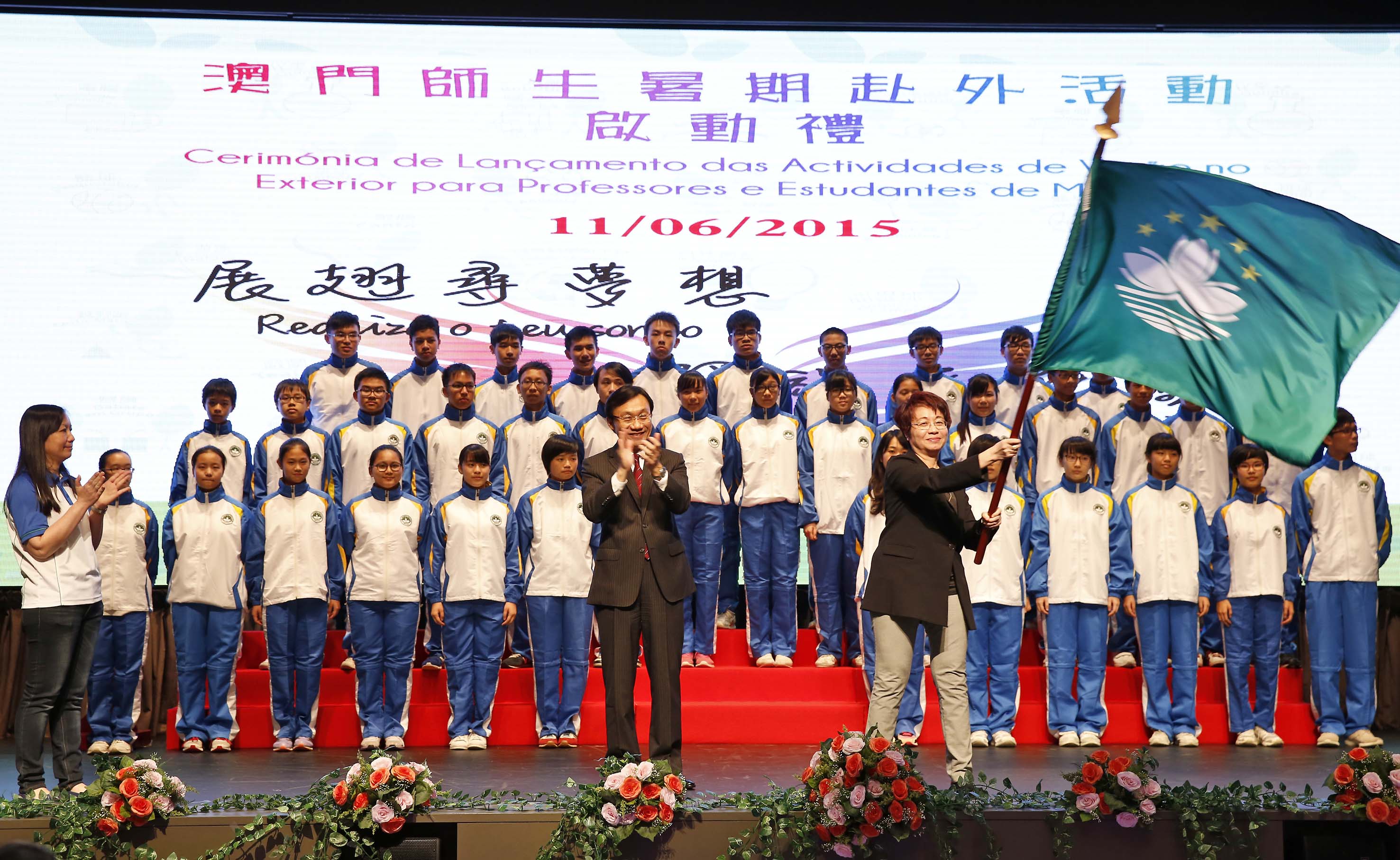 A “Cerimónia de Lançamento das Actividades de Verão no Exterior para Professores e Estudantes de Macau” teve lugar na tarde do dia 11 de Junho, no Auditório da Escola São Paulo e contou com a presença do Secretário para os Assuntos Sociais e Cultura, Alexis, Tam Chon Weng, Directora da DSEJ, Leong Lai, Presidente substituta do Instituto de Acção Social, Wong Im Mui, Subchefe do Estado-Maior da Guarnição em Macau do Exército de Libertação do Povo Chinês, Coronel Chen Zhaoyang, Subdirector do Departamento de Cultura e Educação do Gabinete de Ligação do Governo Popular Central na RAEM, Zhang Xiaoguang, Chefe da Secção da Diplomacia Pública e Imprensa do Comissariado do Ministério dos Negócios Estrangeiros da República Popular da China na RAEM, Li Nan, Assessores do Gabinete do Secretário para os Assuntos Sociais e Cultura, Wai Cheng Iong e Lam Io Pak, Subdirectores da DSEJ, Lou Pak Sang e Kuok Sio Lai, Subdirector da Direcção dos Serviços para os Assuntos Laborais, Lau Wai Meng, e ainda vogais do Conselho de Educação para o Ensino Não Superior, do Conselho de Juventude e do Conselho Profissional do Pessoal Docente, representantes das entidades colaboradoras, os directores das escolas e delegações, envolvendo, ao todo, cerca de 1.000 professores e estudantes.