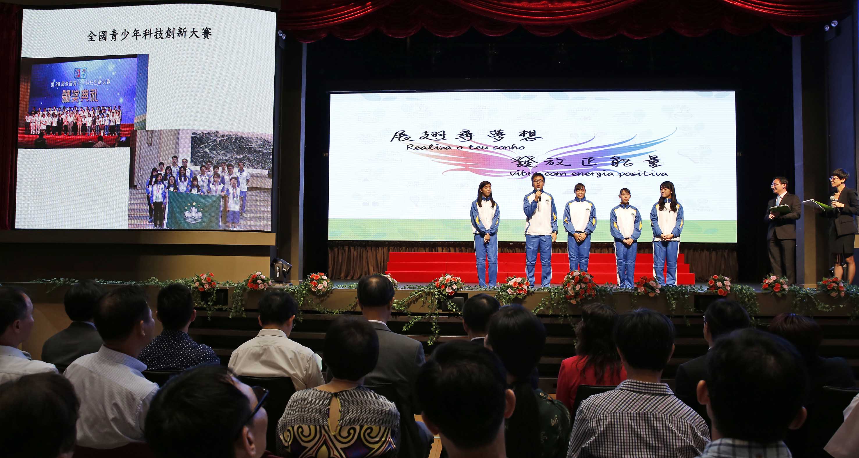 A chefe da delegação Leong Lai recebeu a bandeira da RAEM, das mãos do Secretário para os Assuntos Sociais e Cultura, Alexis, Tam Chon Weng e entregou-a aos representantes dos professores e alunos, simbolizando a prontidão de todos para se deslocarem a diferentes locais, em representação da RAEM, para aí realizarem intercâmbio e aprendizagem, para contribuírem, no futuro, com os conhecimentos adquiridos para o desenvolvimento social. O Secretário incentivou, no seu discurso, os professores e alunos das delegações a obterem mais experiências de vida e mais conhecimentos, a reforçarem a sua capacidade competitiva e a criarem uma rede interpessoal mais ampla através da participação nos diversos tipos de actividades. Durante a cerimónia foram apresentados vídeos sobre a participação anterior dos estudantes em competições e em actividades de intercâmbio e convidados os representantes dos professores e dos alunos para, no palco, partilharem os destaques e experiências adquiridas nas actividades do ano anterior, bem como para exporem os seus sentimentos e expectativas no momento antes da partida para as actividades deste ano. A organização preparou espectáculos maravilhosos, representantes da Associação de Taekwondo de Macau encorajaram a delegação, em jeito de demonstração, quebrando algumas placas com golpes ágeis de pontapé e gritos de luta e os representantes da Escola dos Moradores de Macau apresentaram um espectáculo fantástico de luta de robôs. Criou-se, assim, uma boa atmosfera, com reacções entusiásticas dos professores e alunos.