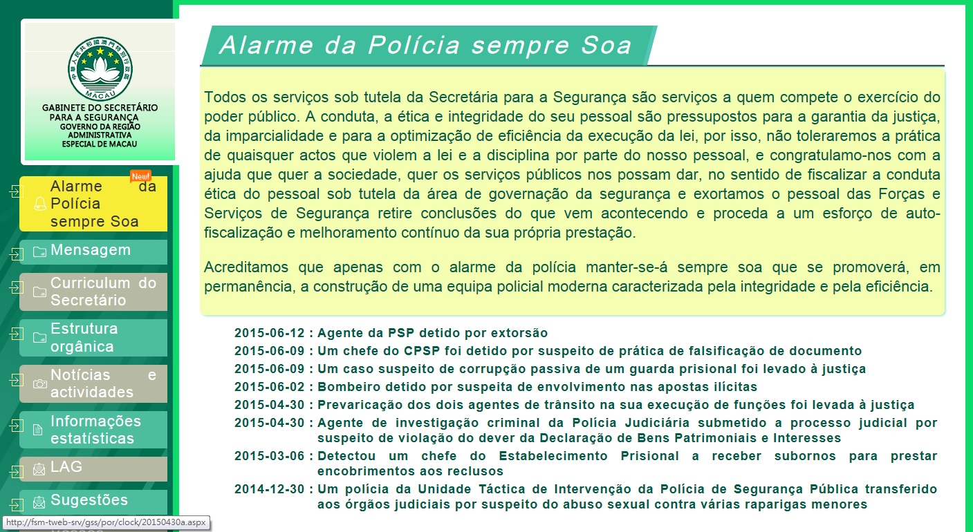 Uma nova coluna intitulada “Alarme da Polícia sempre Soa” será acrescentada ao actual website do Gabinete do Secretário para a Segurança, no dia 16 de Junho de 2015 (terça-feira), a fim de melhor publicitar as notícias sobre a actividade policial, elevar o grau de transparência, reforçar o trabalho de gestão disciplinar do pessoal, alcançar o objectivo de auto-fiscalização e obter a atenção, acompanhamento e sindicância permanente da população relativamente à eficiência do trabalho que levamos a efeito em conformidade com as Linhas de Acção Governativa, assim contribuindo para uma maior eficácia do mecanismos de fiscalização internos e externos.