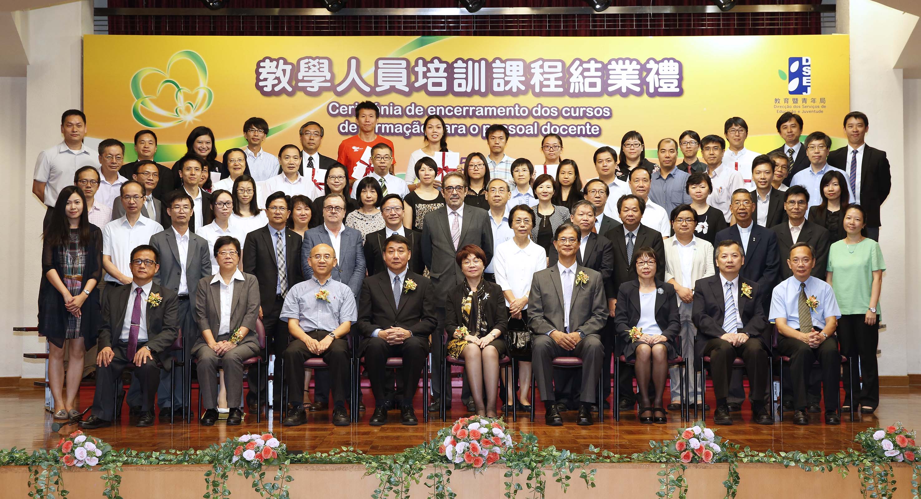 No ano lectivo de 2014/2015 (até ao dia 1 de Julho), a Direcção dos Serviços de Educação e Juventude (DSEJ) realizou 378 acções de formação para o pessoal docente, com uma duração total de 5.001 horas, disponibilizando 15.960 vagas. Para partilhar com o pessoal docente os resultados frutíferos e a satisfação alcançada após o término destas formações e, ao mesmo tempo, incentivar estes profissionais para participarem na aprendizagem contínua e contribuírem para a reforma pedagógica, a DSEJ realizou a “Cerimónia de encerramento dos cursos de formação para o pessoal docente” na tarde do dia 15 de Julho, no Auditório do Colégio de Santa Rosa de Lima - Secção Inglesa.