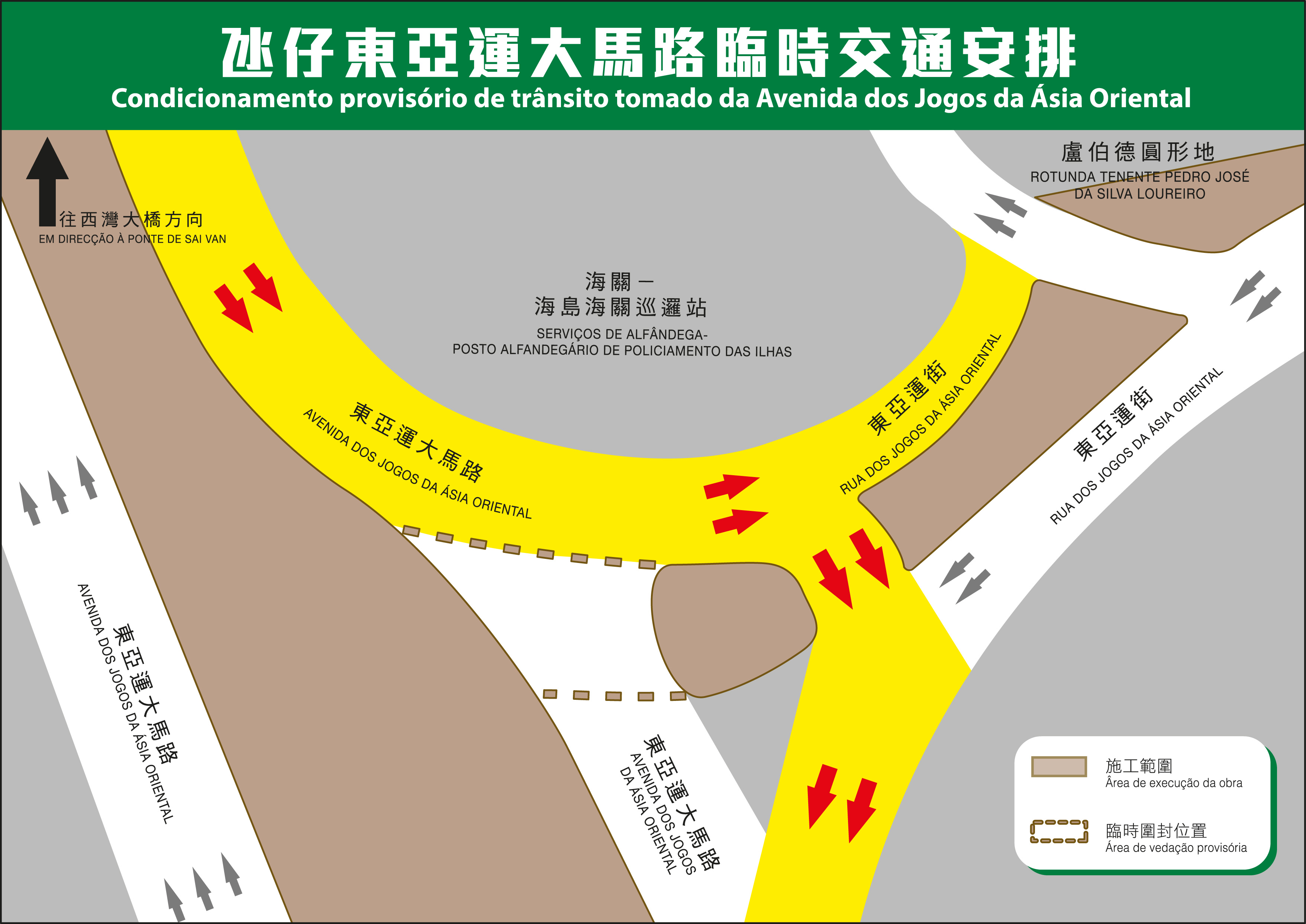Com vista à execução de elevação e montagem das peças pré-fabricadas do viaduto da Linha da Taipa do Metro Ligeiro, um troço da Avenida dos Jogos da Ásia Oriental, junto da Rua dos Jogos da Ásia Oriental, será vedado ao trânsito a partir de sábado (dia 18). Durante este período, os veículos que circulem na Ponte de Sai Van, em direcção ao Cotai, poderão passar pela via temporariamente criada na Rua dos Jogos da Ásia Oriental, com a duração de 30 dias.