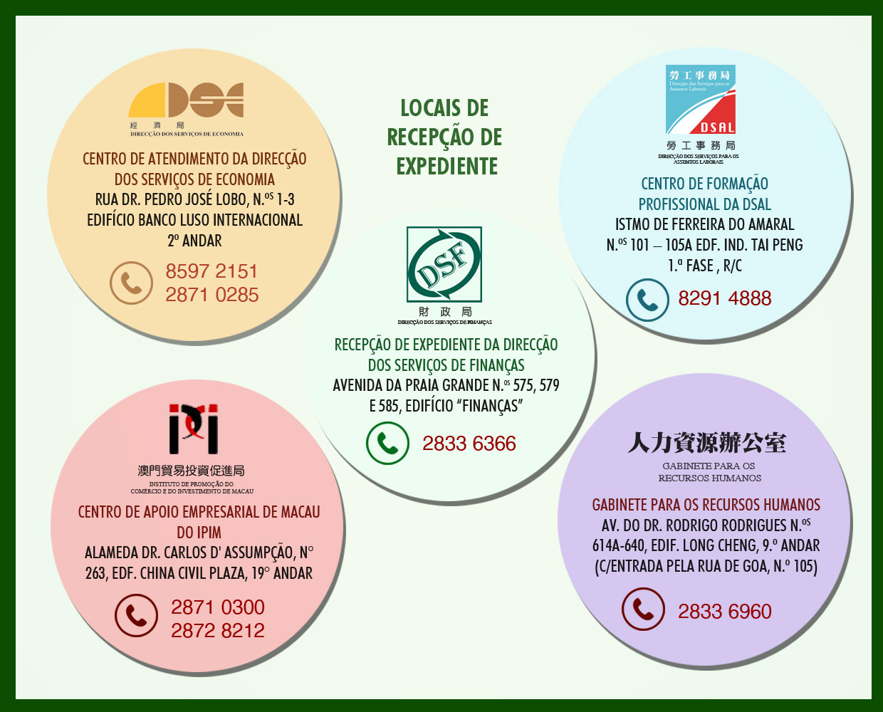 O Governo da RAEM vai, continuamente, recolher sugestões sobre o serviço de recepção dos expedientes junto aos cidadãos, para a revisão e melhoramento do procedimento administrativo, com vista a facultar ao público serviços mais abrangentes. Para quaisquer informações adicionais, por favor ligar para os seguintes telefones: 28728212 ou 28710300.