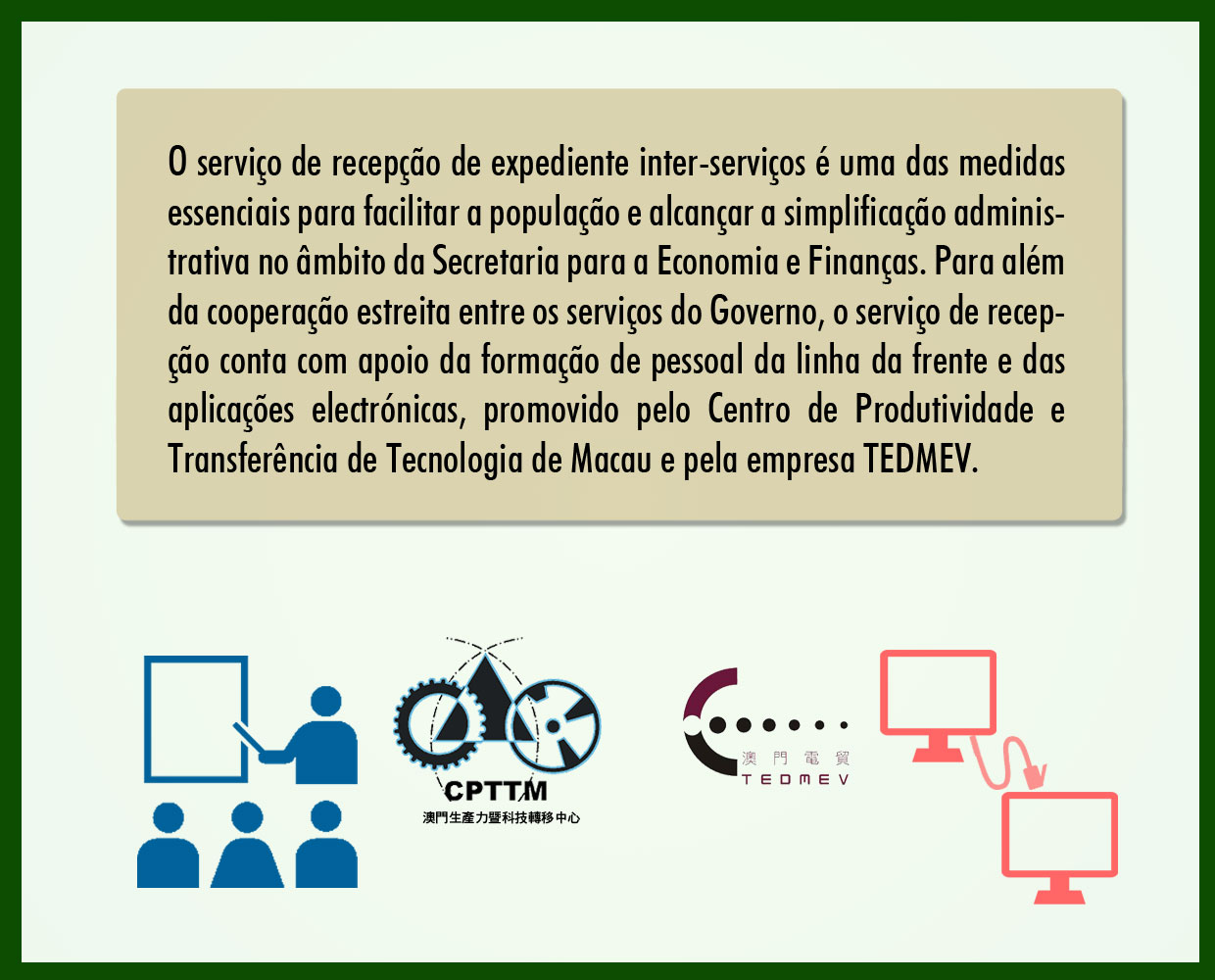 O serviço de recepção de expediente inter-serviços é uma das medidas essenciais para facilitar a população e alcançar a simplificação administrativa no âmbito da Secretaria para a Economia e Finanças. Para além da cooperação estreita entre os serviços do Governo, o serviço de recepção conta com apoio da formação de pessoal da linha da frente e das aplicações electrónicas, promovido pelo Centro de Produtividade e Transferência de Tecnologia de Macau e pela empresa TEDMEV.