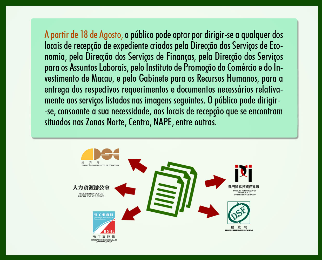 Com o objectivo de facilitar a população, alcançar a simplificação administrativa, bem como a optimização dos serviços da Administração Pública, prestando ao público um serviço de qualidade altamente eficiente e conveniente, a Direcção dos Serviços de Economia, a Direcção dos Serviços de Finanças, a Direcção dos Serviços para os Assuntos Laborais, o Instituto de Promoção do Comércio e do Investimento de Macau, e o Gabinete para os Recursos Humanos, do âmbito da Secretaria para a Economia e Finanças, irão lançar conjuntamente, no dia 18 de Agosto de 2015, um “Serviço de recepção de expediente inter-serviços no âmbito da Secretaria para a Economia e Finanças”.