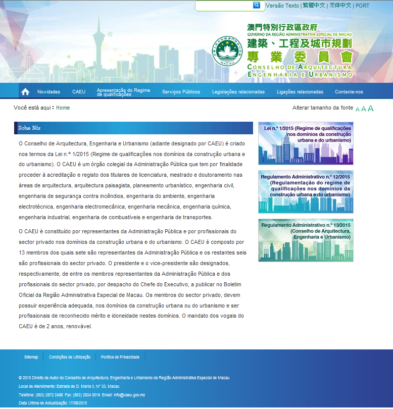 Os titulares dos graus académicos das 13 áreas de especialização enquadradas no Regime de Qualificações nos Domínios da Construção Urbana e do Urbanismo, adiante simplesmente designado por Regime de Qualificações, em vigor a partir de 1 de Julho e aprovado pela Lei n.º 1/2015, poderão mediante a acreditação e registo obter o respectivo título profissional, assim como poderão após inscrição obter a qualificação para o exercício das suas funções. O Governo da RAEM espera que com a criação do Regime de Qualificações seja possível eficazmente regulamentar a actividade do sector da construção civil de modo a conjugar com o desenvolvimento social, elevando assim o nível profissional dos arquitectos e urbanistas, e alinhando por fim à tendência internacional, de modo a alcançar por conseguinte a meta que é na profissionalização das diversas áreas. Os técnicos abrangidos no âmbito das disposições transitórias fixadas no Regime de Qualificações poderão a partir de hoje solicitar a qualificação e o registo profissional, de modo a lhes permitir, após a conclusão da inscrição ou renovação da inscrição, continuar o exercício da sua actividade.