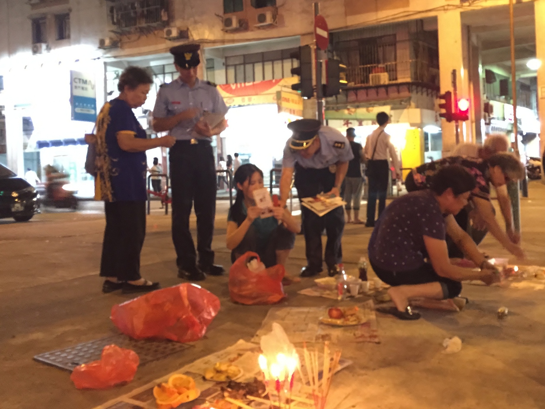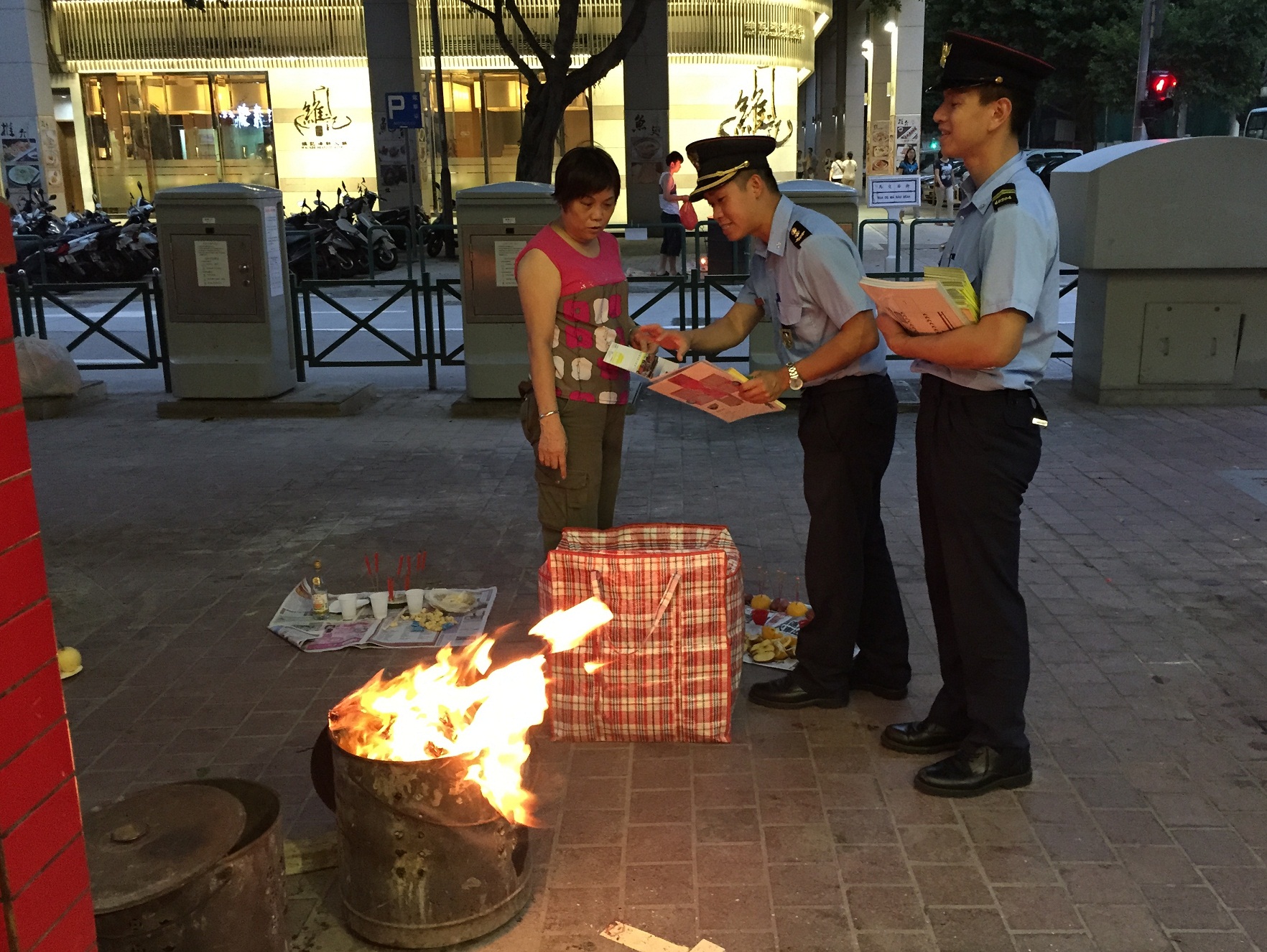 Durante a Festa dos Espíritos Esfomeados, os residentes costumam seguir a tradição chinesa de praticar actos de culto. No intuito de reforçar a consciência de prevenção contra incêndios dos cidadãos e reduzir incêndios, o Corpo de Bombeiros (CB) organizou uma série de actividades, incluindo visitas às associações da comunidade, realização das palestras, publicidade nos reclames luminosos e na rádio, inspecções dos actos de culto e distribuição de materiais promocionais aos residentes durante a noite desses dias.