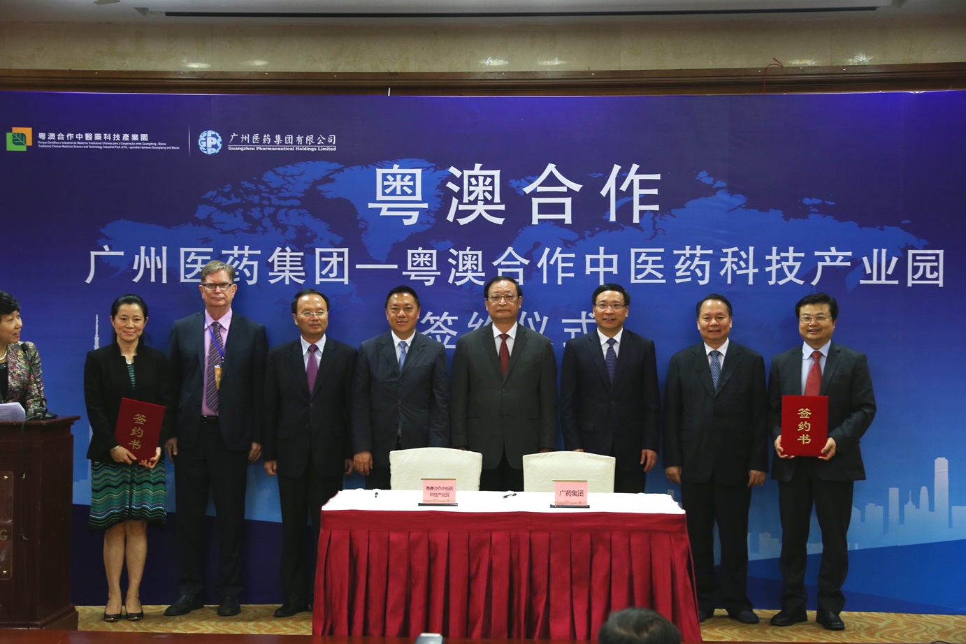 O Parque Científico e Industrial de Medicina Tradicional Chinesa para a Cooperação entre Guangdong-Macau (adiante designada por "Parque Industrial") e a Guangzhou Pharmaceutical Holdings Limited realizaram a cerimónia de assinatura do Acordo-Quadro de Cooperação, durante a tarde do dia 7 de Setembro, no Hotel de Dongfang, em Guangzhou. No âmbito do Acordo-Quadro, e aproveitando a complementaridade dos serviços prestados, as Partes cooperarão para o desenvolvimento da globalização e modernização da medicina tradicional chinesa. Participaram nesta cerimónia os convidados seguintes: o Vice-Ministro da Comissão Nacional de Saúde e Planeamento Familiar e Director da Administração Estatal de Medicina Tradicional Chinesa, Dr. Wang Guoqiang, o Secretário para a Economia e Finanças da RAEM, Dr. Leong Vai Tac, o membro permanente do Comité do Município de Guangzhou e Vice-Presidente do Governo de Guangzhou, Dr. Chen Rugui, o Chefe do Gabinete Geral da Administração Estatal de Medicina Tradicional Chinesa, Dr. Zha Dezhong, o Chefe do Departamento de Cooperação Internacional da Administração Estatal de Medicina Tradicional Chinesa, Dr. Wang Xiaopin, o Director de Traditional Chinese Medicine Bureau of Guangdong Province, Dr. Xu Qingfeng, e o Director do Conselho de Administração da Nova Área de Ilha de Hengqin, Dr. Niu Jing. Este Acordo-Quadro de Cooperação foi assinado pela Presidente do Conselho da Administração da Guangdong-Macau Traditional Chinese Medicine Technology Industrial Park Development Co., Ltd., Dra. Lu Hong, e pelo Presidente do Conselho da Administração da Guangzhou Pharmaceutical Holdings Limited, Dr. Li Chuyuan.