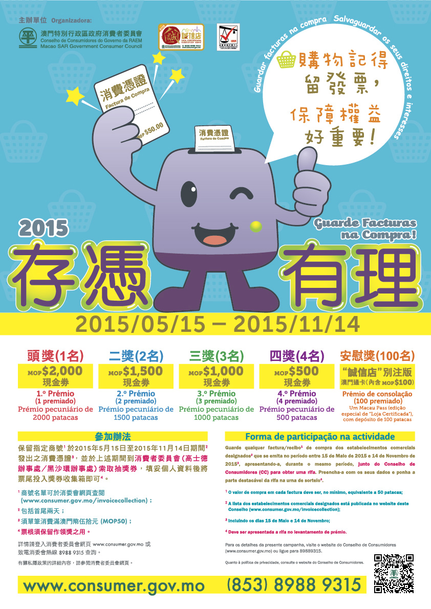 Lançada em Maio, a campanha “Guarde Facturas na Compra!” de 2015 até agora já conta com a participação de muitos consumidores. Nota-se que a actividade terminará em 14 de Novembro. Os consumidores, se fizeram consumo no valor superior a 50 patacas num estabelecimento comercial submetido a esta campanha, podem pedir à loja para colocar no recibo um autocolante de identificação da campanha, e depois apresenta o recibo junto do CC (Av. Horta e Costa n.º 26 ou Rua Nova da Areia Preta, Centro de Serviços da RAEM, 1.º piso, Zona M) para obter uma rifa e participar no sorteio. A campanha terá vários prémios como: 1.º prémio, de 2000 patacas (1 premiado), 2.º prémio, de 1500 patacas (2 premiados), 3.º prémio, de 1000 patacas (3 premiados), 4.º prémio, de 500 patacas (4 premiados) e o prémio de consolação (100 premiados que podem obter um Macau Pass (edição especial de “Loja Certificada”), com depósito de 100 patacas). Este ano a campanha conta com a participação de 254 estabelecimentos comerciais.