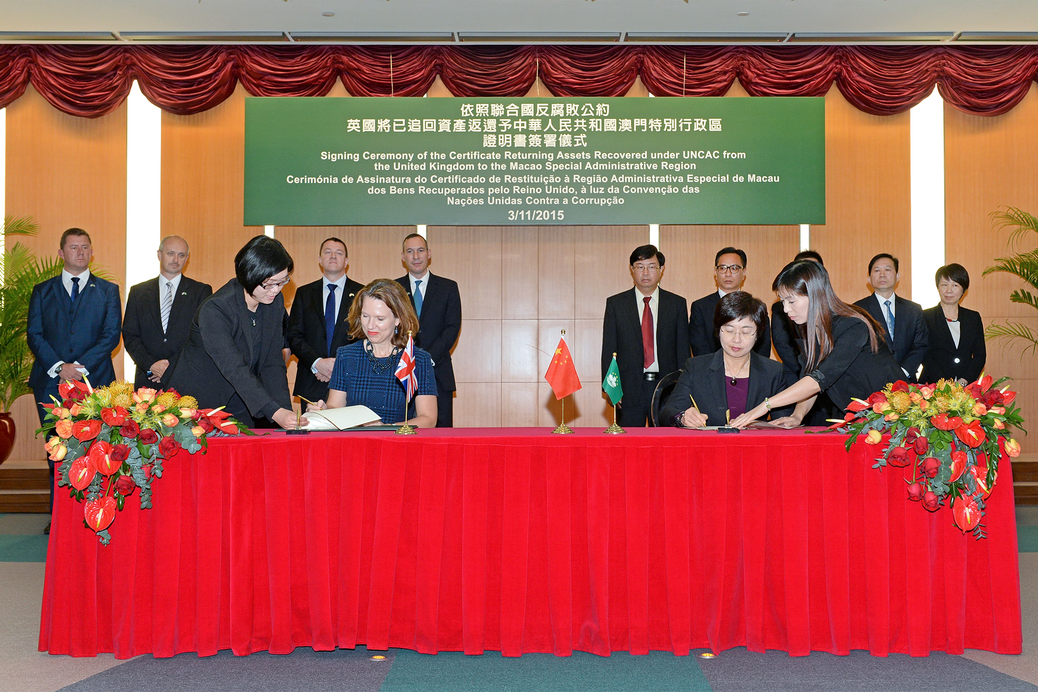 No dia 3 de Novembro de 2015, teve lugar, na sala polivalente da Sede do Governo da RAEM, a Cerimónia de Assinatura do Certificado de Restituição à Região Administrativa Especial de Macau pelo Reino Unido dos bens ilícitos do caso de Ao Man Long, entre o Governo da RAEM e o Governo do Reino Unido à luz da Convenção das Nações Unidas Contra a Corrupção. A Cerimónia teve como outorgantes a Secretária para a Administração e Justiça, Sónia Chan, em representação do Governo da RAEM, e a Cônsul Geral Britânica, Caroline Elizabeth Wilson, em representação do Governo do Reino Unido.