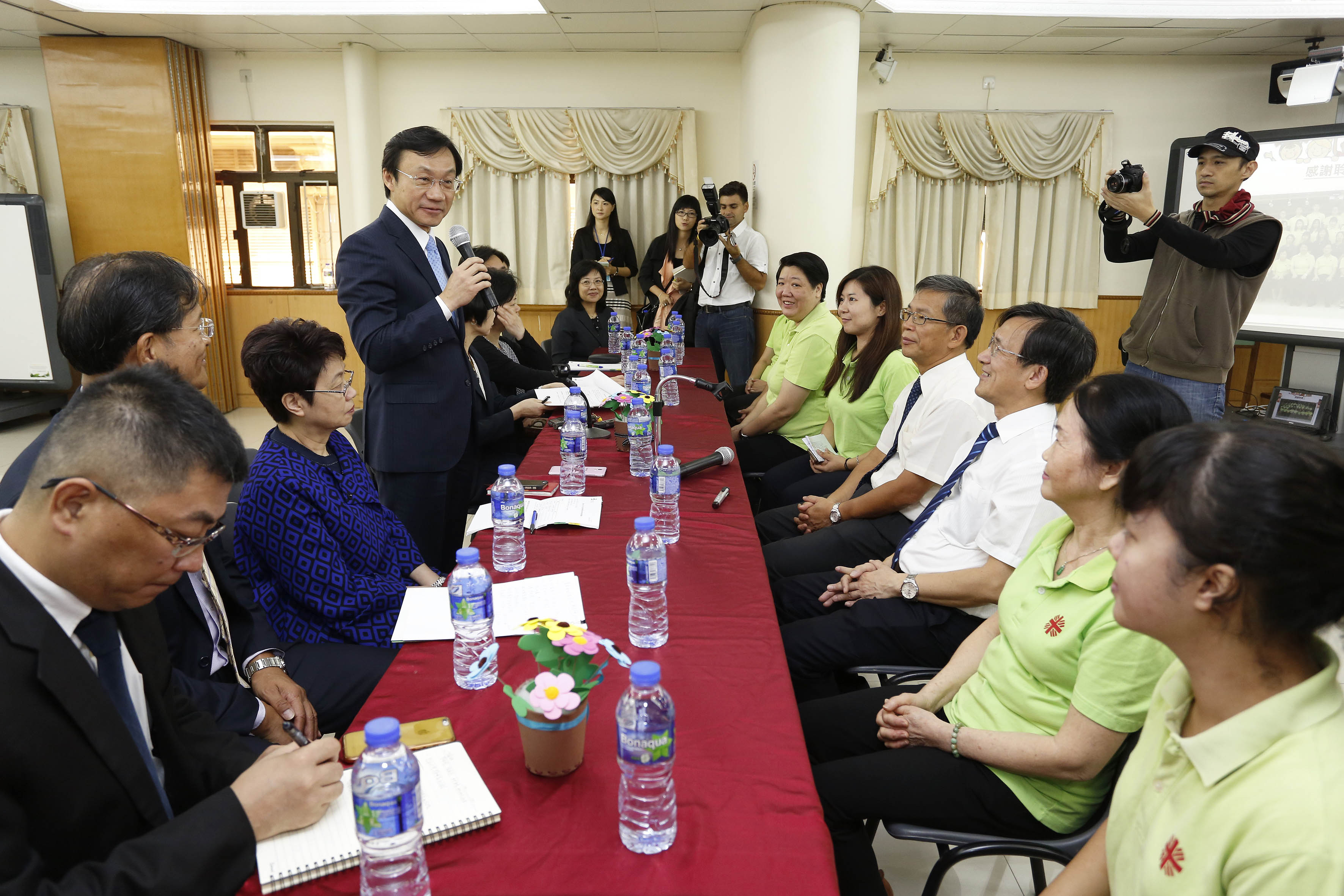 Durante a conversa que estabeleceu com os dirigentes e representantes dos docentes da escola, Alexis Tam frisou que, no prazo de 15 a 20 anos, o governo irá concretizar, gradualmente, e através de um planeamento de curto, médio e longo prazo, o projecto “Obra de céu azul”, com vista a resolver completamente a questão das 15 escolas de educação regular que se situam nos pódios, permitindo aos alunos usufruírem de uma aprendizagem descontraída, num ambiente sob o céu azul.