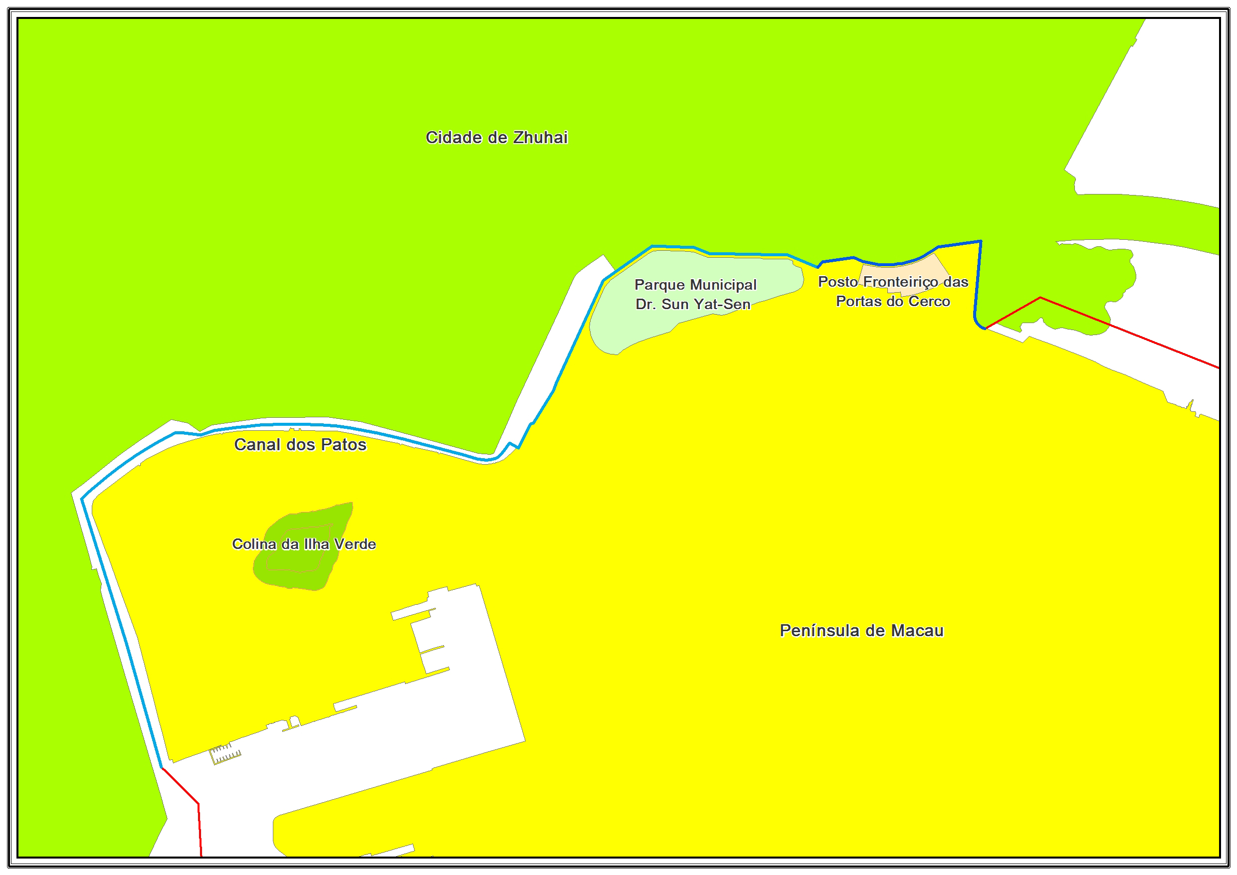A parte marítima é composta por seis segmentos, que são as do Porto Interior, do Canal da Taipa-Coloane, das águas a sul de Macau, das águas a leste de Macau, da ilha artificial e das águas a norte de Macau. A parte terrestre é composta por dois segmentos, que são o do Posto Fronteiriço das Portas do Cerco de Macau e o do Canal dos Patos