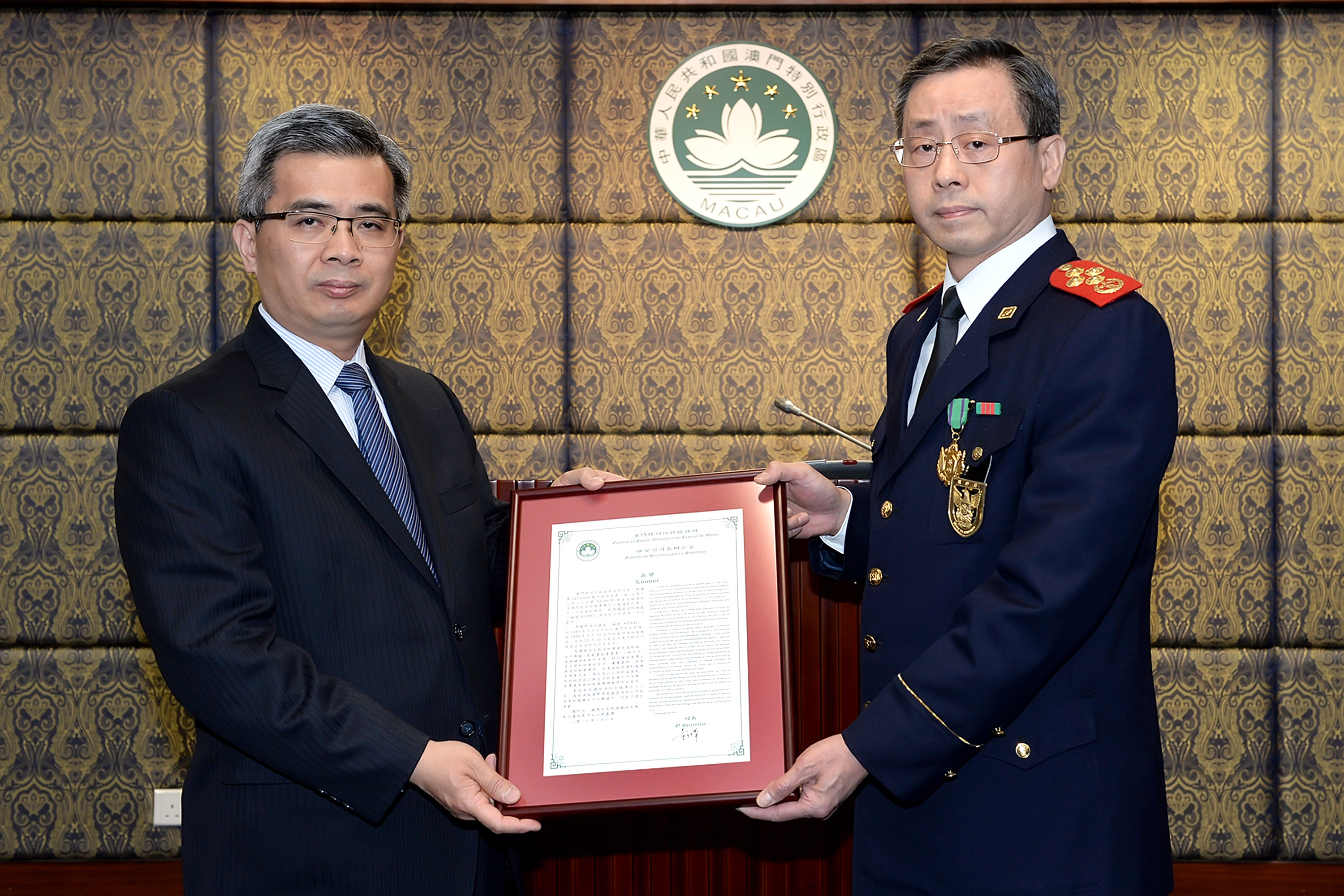 Com a finalidade de elogiar os trabalhos que o Comandante do Corpo de Bombeiros, Chefe-mor, Ma Io Weng, levou a efeito ao longo de toda a sua vida profissional, sublinhando, designadamente, a excelência do seu contributo quanto à optimização da eficiência da prestação de socorro e de emergência, bem como quanto aos trabalhos de prevenção e de combate a incêndios, hoje, dia 15, e porque se aproxima a data da sua retirada por aposentação, o Secretário para a Segurança, Wong Sio Chak procedeu à atribuição de um LOUVOR.