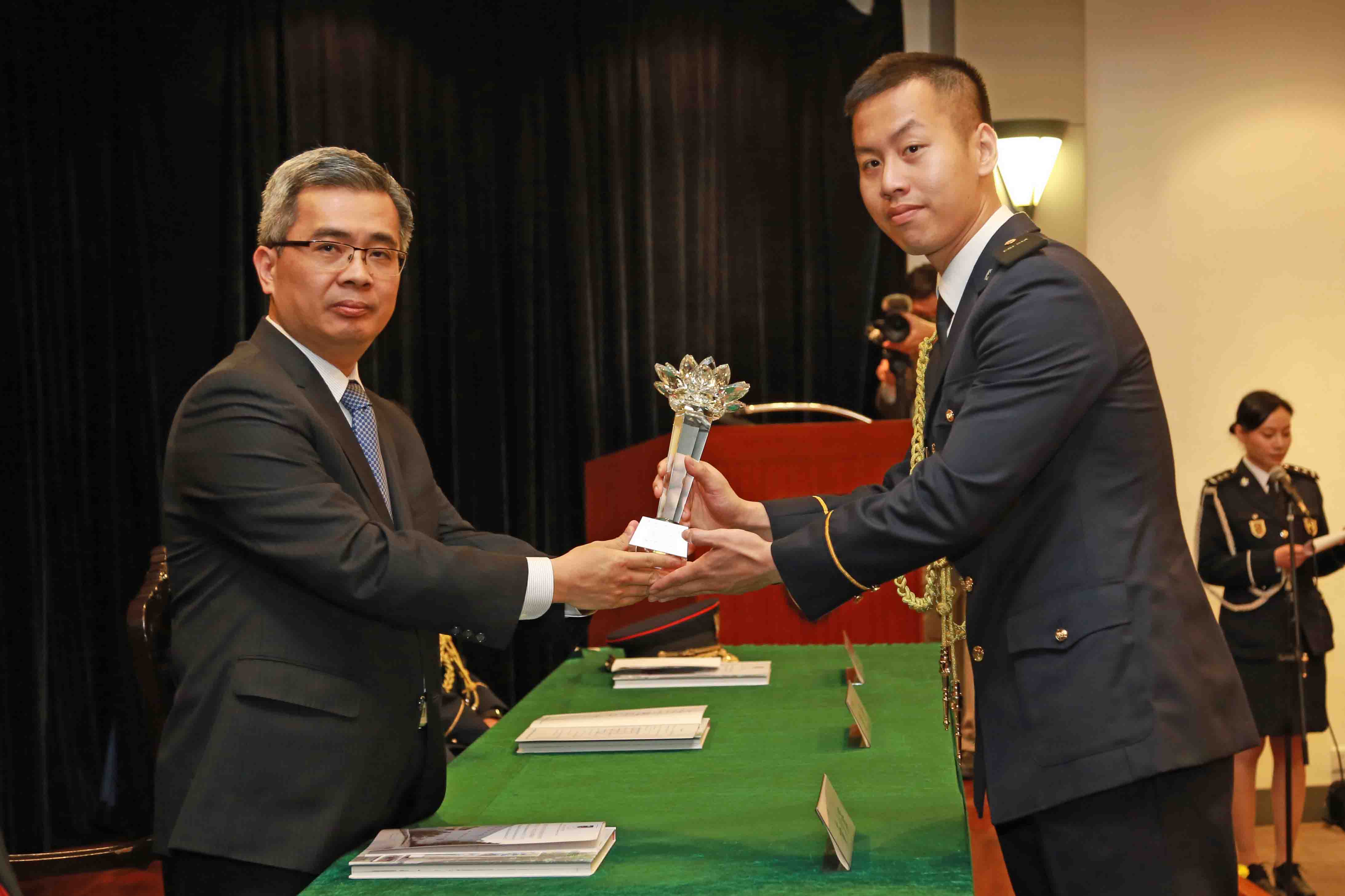Os premiados de cada prémio do curso são respectivamente: o premiado do Prémio de Flor de Lótus é o aspirante a oficial destinado ao CB, Chan Hou In, o premiado do Prémio do Curso de Polícia de Segurança Pública é o aspirante a oficial destinado ao CPSP, Ho Ka Kit, o premiado do Prémio do Curso de Corpo de Bombeiros é o aspirante a oficial destinado ao CB, Chan Hou In, o premiado do Prémio Forças de Segurança de Macau é o aspirante a oficial destinado ao CPSP, Lin Ming, o premiado do Prémio Qu Yuan é o aspirante a oficial destinado ao CPSP, Lin Ming, o premiado do Prémio Luís de Camões é o aspirante a oficial destinado ao CB, Chan Hou In, e os premiados do Prémios de Aptidão Intelectual são os aspirantes a oficial destinados ao CB, Chan Hou In, Lao Tak Cheong e Ieong Sai On.