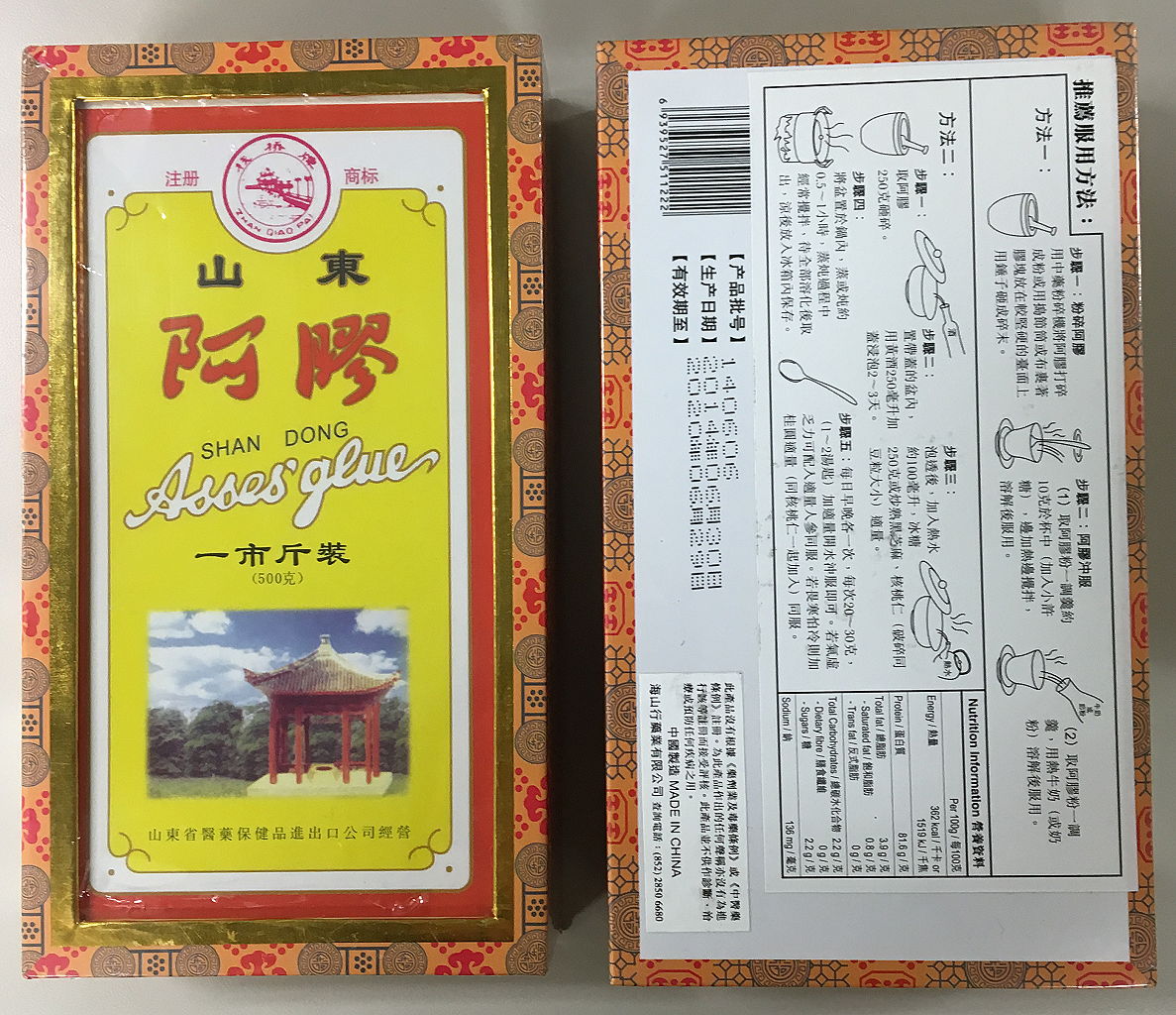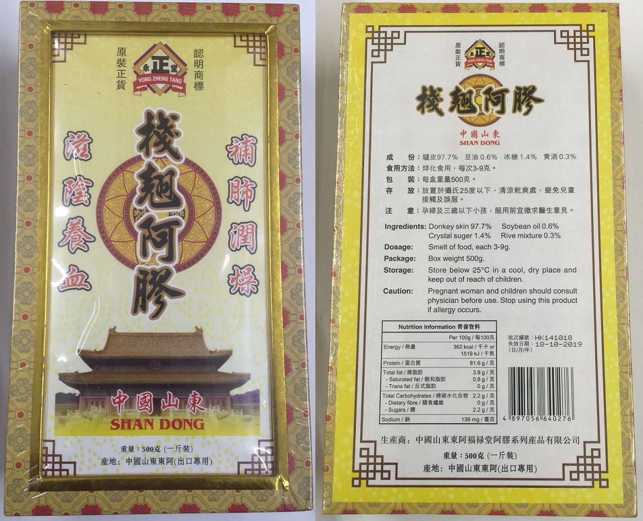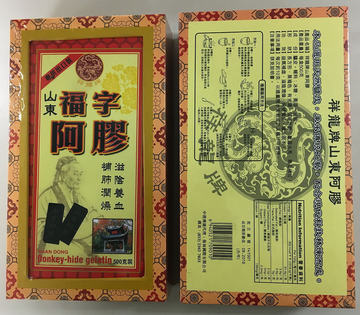 O burro-hide gelatina é produto feito com base na fritura de pele de burro, e consta da lista de ingredientes medicinais chineses, Parte II, usados na RAEM, que visa a tonificação do sangue, evitar o sangramento, nutritivo Yin e evita a desidratação. De acordo com as disposições o burro-hide gelatina não pode conter com ingredientes de animais nem da pele de burro.