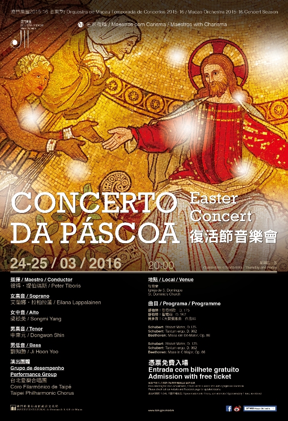 A Orquestra de Macau (OM), sob a égide do Instituto Cultural, apresenta o Concerto de Páscoa, nos dias 24 e 25 de Março (Quinta e Sexta-Feira), pelas 20:00 horas, na Igreja de S. Domingos. A OM convidou o ilustre maestro Peter Tiboris, que actua com frequência em Carnegie Hall, a juntar-se ao Coro Filarmónico de Taipé, a uma das sopranos internacionalmente famosa, Eilana Lappalainen, e ainda a três solistas sul-coreanos, a meio-soprano Yang Songmi, o tenor Shin Dongwon e o baixo Yoo Ji Hoon, para dirigir a Missa em Dó Maior de Ludwig van Beethoven e obras sacras de Franz Schubert. A entrada é livre.