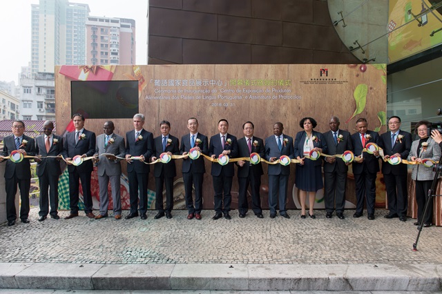 A cerimónia de inauguração e assinatura do Centro de Exposição dos Produtos Alimentares dos Países de Língua Portuguesa teve lugar hoje às 15h00, e foram convidados para presidir à cerimónia o Secretário para a Economia e Finanças do Governo da RAEM, Dr. Lionel Leong Vai Tac, o Director-Geral do Departamento para os Assuntos de Taiwan, Hong Kong e Macau do Ministério do Comércio da China, Dr. Sun Tong, o Sub-Comissário do Comissariado do Ministério dos Negócios Estrangeiros da China na RAEM, Dr. Pan Yundong, o Sub-Director do Departamento para os Assuntos Económicos do Gabinete de Ligação do Governo Popular Central na RAEM, Dr. Kou Ming, o Oficial de Ligação e Director-geral da Ásia e Oceânia do Ministério das Relações Exteriores de Angola, Dr. Samuel Andrade da Cunha, o Oficial de Ligação e Chefe da Divisão para os Assuntos da China e da Mongólia do Ministério das Relações Exteriores do Brasil, Dr. Orlando Leite Ribeiro, a Embaixadora de Cabo Verde na China, Dra. Tânia Romualdo, o Embaixador da Guiné-Bissau na China, Dr. Malam Sambú, o Oficial de Ligação e Director-geral da Ásia e Oceânia do Ministério dos Negócios Estrangeiros e Cooperação de Moçambique , Dr. Belmiro José Malate, o Embaixador de Portugal na China, Dr. Jorge Torres Pereira, o Embaixador de Timor-Leste na China, Dr. Bendito dos Santos Freitas, o Chefe da Delegação das Missões Diplomáticas dos Países de Língua Portuguesa na China, Embaixador João Garcia Bires, o Presidente do Instituto de Promoção do Comércio e do Investimento de Macau (IPIM), Dr. Jackson Chang, o Secretário-Geral do Secretariado Permanente do Fórum para a Cooperação Económica e Comercial entre a China e os Países de Língua Portuguesa (Macau), Dr. Chang Hexi, e a Vice-Presidente da Direcção da Associação Comercial de Macau, Dra. Ho Teng Iat.