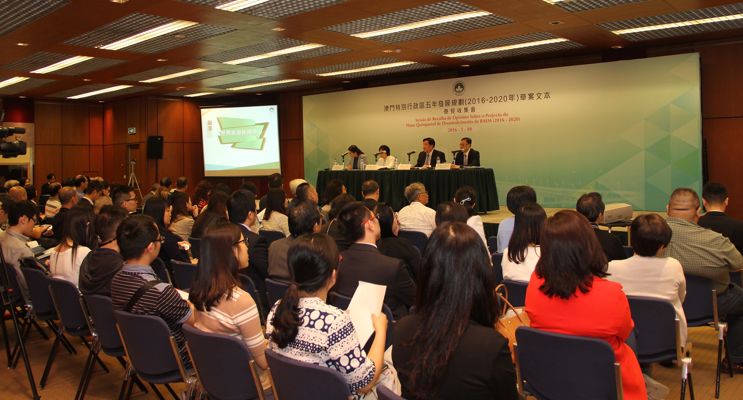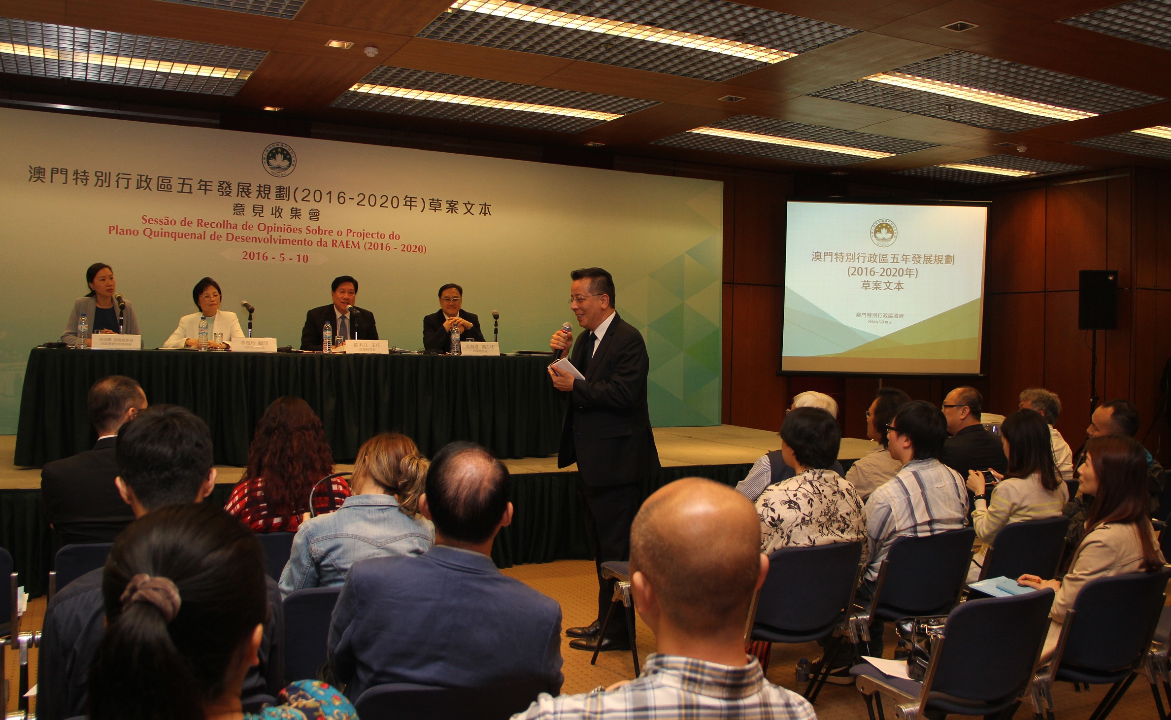 Os presentes apresentaram, dinamicamente, diversas opiniões e sugestões construtivas em prol do melhoramento do projecto do Plano Quinquenal, das quais se destacam a promoção da renovação urbana da zona norte, o Plano pormenor da Zona A dos novos aterros, a flexibilização dos requisitos para a reconstrução dos edifícios, o aumento da capacidade de tratamento das águas residuais, o desenvolvimento da inovação tecnológica, as deslocações inteligentes, a construção do complexo de cuidados de saúde das Ilhas, o planeamento geral das políticas de saúde, o desenvolvimento equilibrado do serviço de prestação de saúde público e privado, a passagem da velhice na zona de antiga residência, as oportunidades de emprego para as pessoas da terceira idade, a promoção das políticas favoráveis às famílias, a optimização do papel dos órgãos consultivos do governo, a utilização de métodos concisos para fortalecer a promoção e divulgação do projecto, a promoção dos templos e festivais culturais, a promoção da aprendizagem do Português, entre outros. No decorrer da sessão, houve opiniões que transpareceram a preocupação de que o atraso na publicação do projecto oficial poderá afectar o resultado de execução do Plano e que o planeamento do futuro desenvolvimento de Coloane, a reavaliação da construção do metro ligeiro, o planeamento geral do transporte da zona norte, a igualdade de género, a economia marítima, entre outros aspectos, são questões que merecem uma profunda reflexão e aperfeiçoamento.