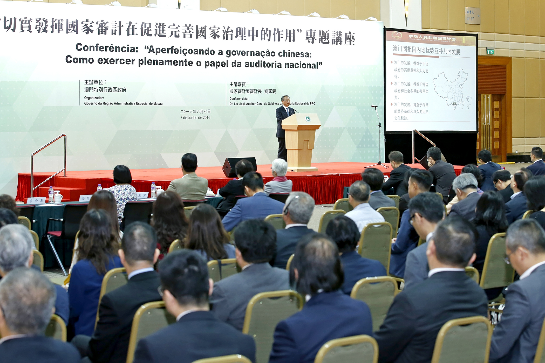 No dia 7 de Junho, a convite do Governo da RAEM, o Auditor-Geral do Gabinete da Auditoria Nacional (GAN) e presidente do Conselho Directivo da Organização Internacional de Instituições Superiores de Controlo (INTOSAI), Liu Jiayi,esteve presenteno Centro de Convenções Internacionais da Nave Desportiva dos Jogos da Ásia Oriental de Macaupara proferir uma conferência intitulada“Aperfeiçoando a governação chinesa: Como exercer plenamente o papel da auditoria nacional”. O evento foi moderado pelo Comissário da Auditoria de Macau, Ho Veng On, e contou com a presença de mais de 300 participantes, incluindo o Chefe do Executivo, Chui Sai On, o Vice-Presidente do Comité Nacional da Conferência Política Consultiva do Povo Chinês, Ho Hau Wah, os titulares dos principais cargos do Governo da RAEM,membros do Conselho Executivo, dirigentes dos serviços públicos, delegados de Macau à Assembleia Popular Nacional, membros de Macau no Comité Nacional da Conferência Consultiva Política do Povo Chinês e membros da Comissão Eleitoral para a eleição do quarto mandato do Chefe do Executivo.