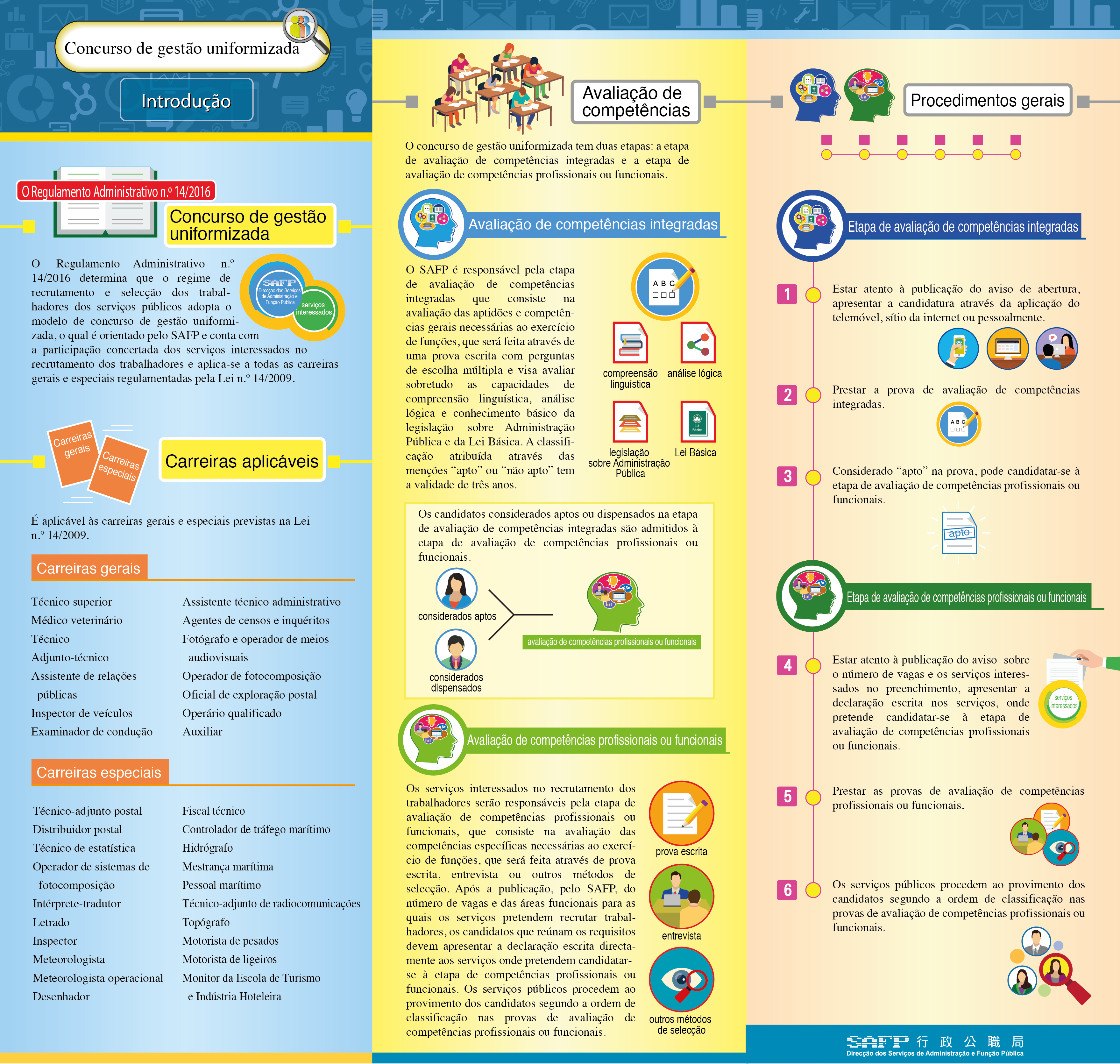 O Governo da RAEM implementa assim as medidas reformistas julgadas necessárias ao sistema de gestão dos trabalhadores dos serviços públicos, orientada pelas suas competências e conjugada com métodos eficazes, tendo em conta as competências exigidas para o exercício de funções das diversas carreiras. É assim adoptado um modelo de recrutamento uniformizado mediante o qual o SAFP assume um papel predominante e orientado perante o serviço interessado no recrutamento de trabalhadores para participarem em conjunto na realização de diversos tipos de avaliação.