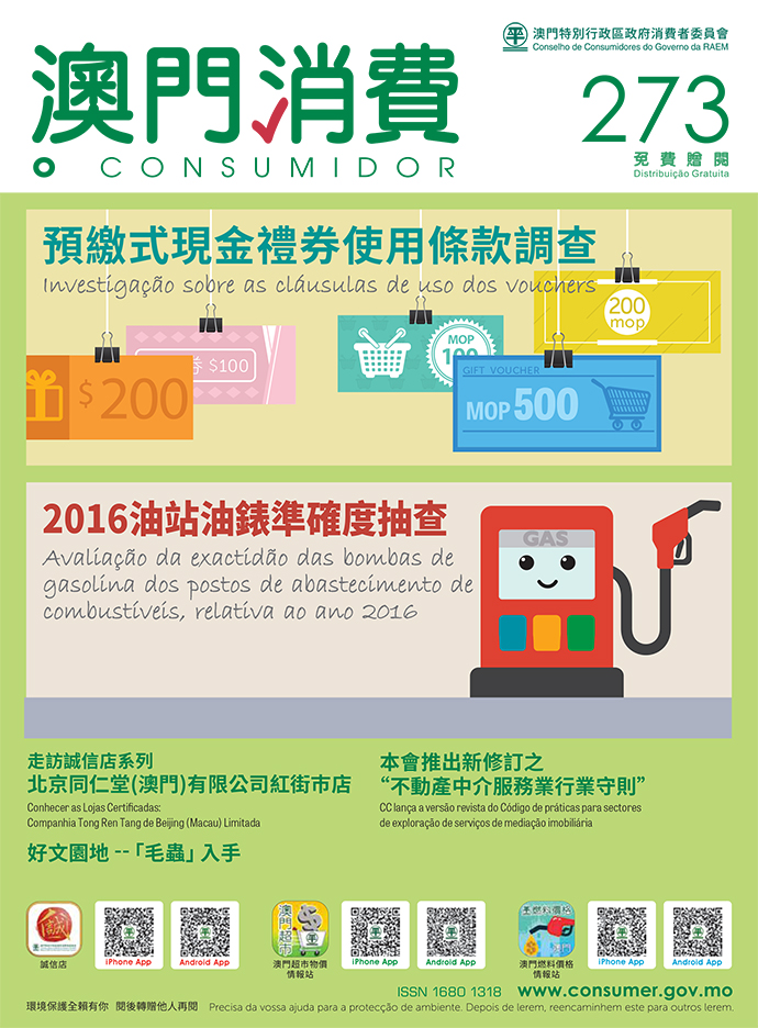 A revista “O Consumidor” n.º 273 publica ainda o resultado da avaliação da exactidão das bombas de gasolina dos postos de abastecimento de combustíveis, relativa ao ano 2016, a entrevista com a Companhia Tong Ren Tang de Beijing (Macau) Limitada e um artigo sobre o Código de práticas para sectores de exploração de serviços de mediação imobiliária.