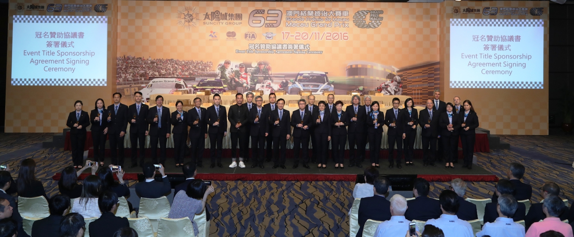 Durante a cerimónia, Sr. Pun Weng Kun, Presidente do Instituto do Desporto do Governo da RAEM e Sr. Alvin Chau, Director Executivo e Presidente do Suncity Grupo, marcou a assinatura do acordo do Título de Patrocínio com a apresentação do cheque gigante. O evento deste ano é oficialmente designado por Suncity Grupo 63º Grande Prémio de Macau.