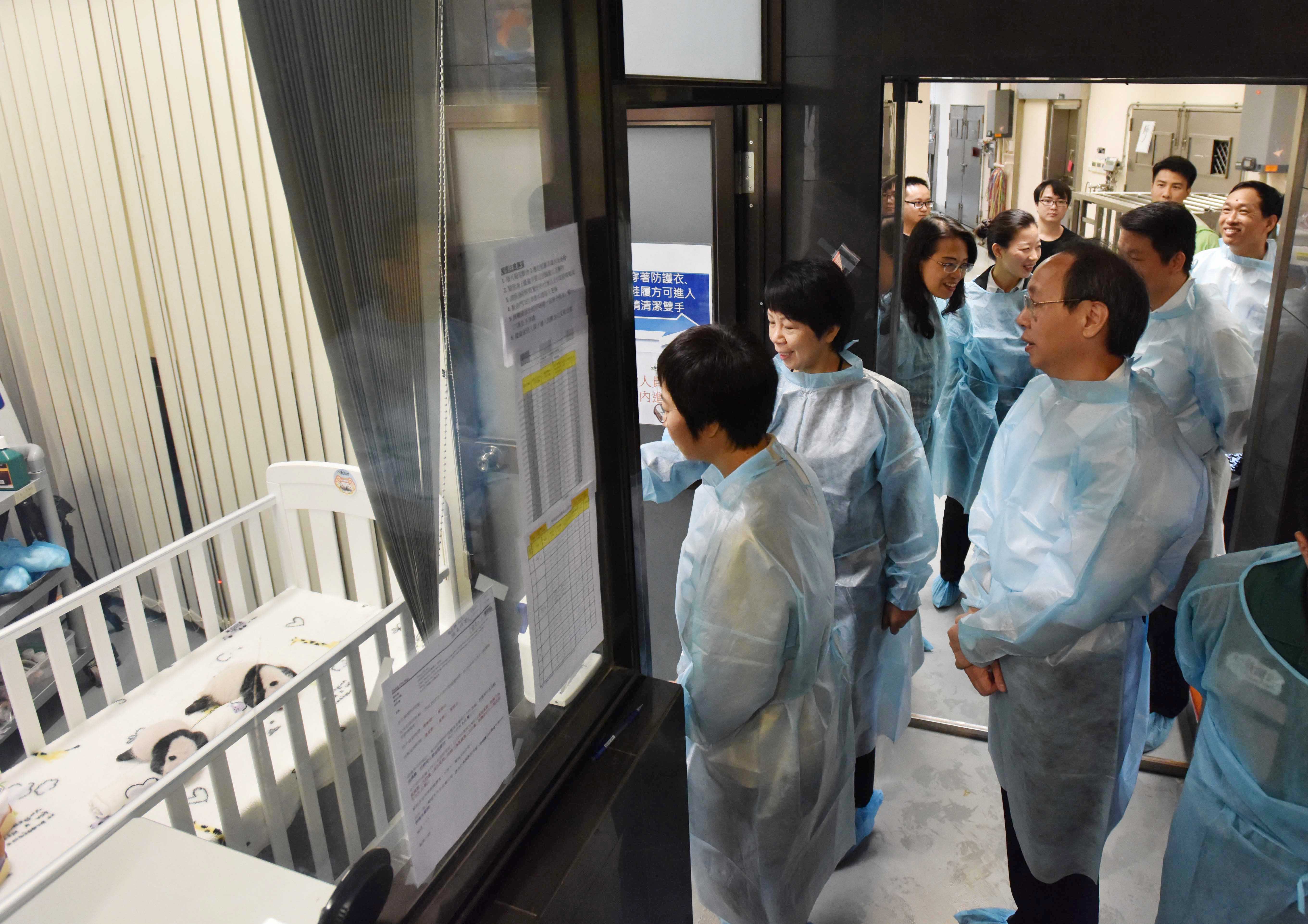 A Chefe do Gabinete da Secretária para a Administração e Justiça, Iao Man Leng, o Presidente substituto e o Vice-Presidente do Conselho de Administração do IACM, Lo Veng Tak e Lei Wai Nong, respectivamente, e o Administrador Leong Kun Fong acompanharam a Secretária para a Administração e Justiça, Chan Hoi Fan, na visita ao par de gémeos, ambos machos. Durante a visita, a secretária inteirou-se ainda da situação dos Pandas Gigantes “Kai Kai”e “Xin Xin”, oferecidos pelo Governo Central. A Secretária para a Administração e Justiça agradeceu aos membros da equipa os esforços e empenho que depositam no tratamento dos pandas gigantes e encorajou-os a continuarem com esses cuidados intensivos para o bem-estar dos gémeos. Chan Hoi Fan tem esperança que, no futuro, quando os cidadãos de Macau conhecerem os pandas bebés estes lhes irão trazer felicidade e alegria.