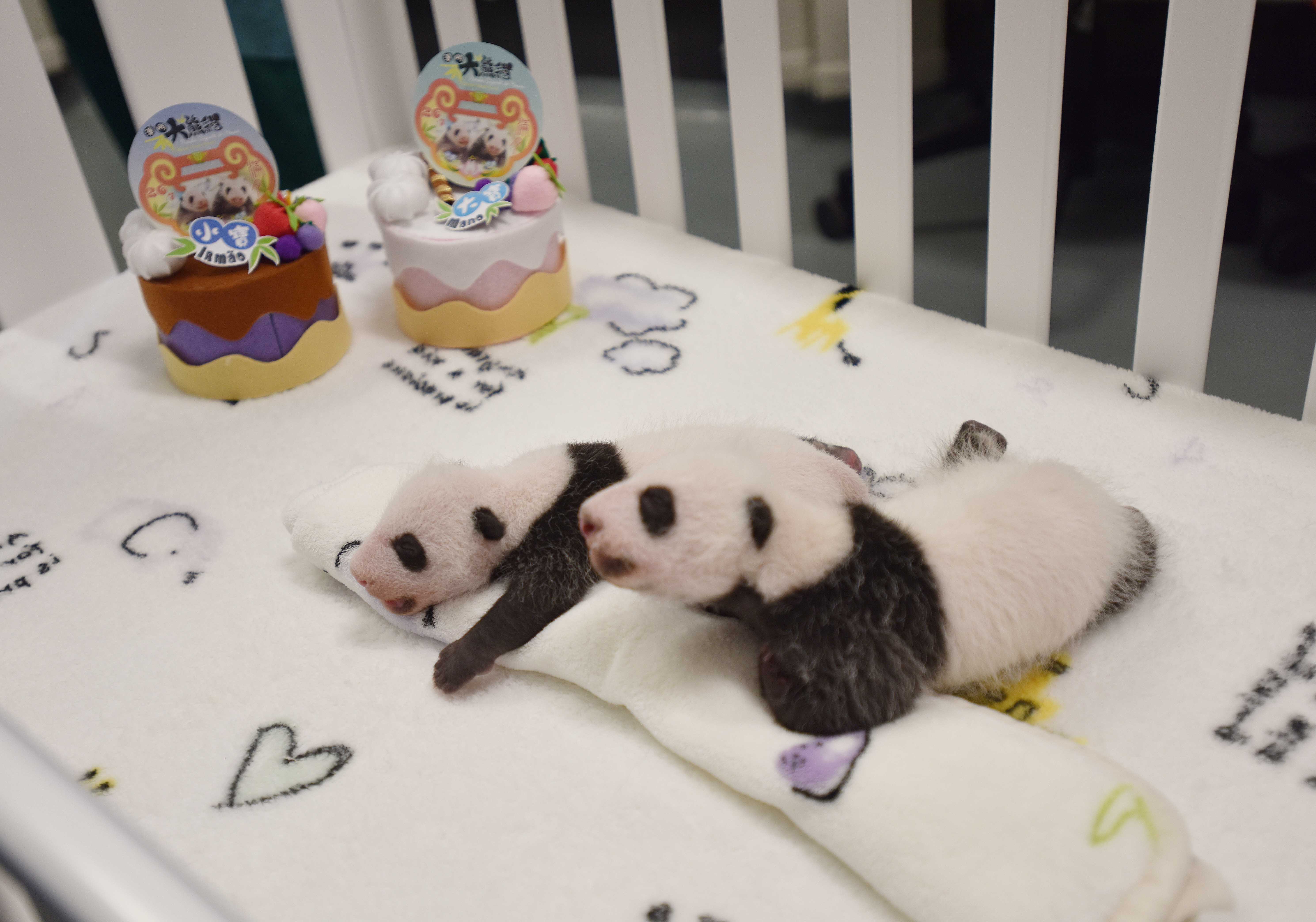 Após um mês de amamentação e de cuidados intensivos dos tratadores, os pandas gémeos “Tai Pou” e “Siu Pou” aumentaram de peso de 135 e 53,8 gramas aquando do nascimento para os actuais 1010,5 e 735,6 gramas. Após a avaliação dos veterinários, os pandas bebés estão de boa saúde, já podendo sair da incubadora e dormir numa cama especial para terem contacto com o ambiente exterior. No que toca à sua aparência, os gémeos já apresentam a maior característica dos pandas gigantes: olheiras pretas e as orelhas, mãos, patas e pêlo no ombro de cor preta, em comparação com o corpo de cor-de-rosa de recém-nascidos.