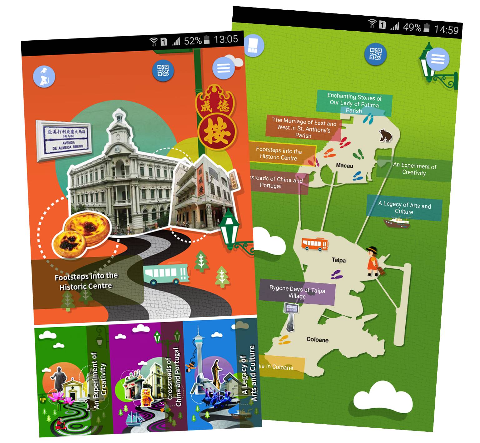 Disponível em chinês (tradicional e simplificado), inglês e português, a aplicação inclui mapas dos oito roteiros, descrições dos pontos turísticos, incluindo do Centro Histórico de Macau inscrito pela UNESCO, espectáculos culturais de rua agendados, restaurantes, carreiras de autocarros, Wi-Fi, casas de banho públicas, e outras informações úteis, ao longo dos roteiros. Os utilizadores também podem fazer o scan de código QR em placas de sinalização ao longo dos roteiros para obter as informações turísticas mesmo offline.