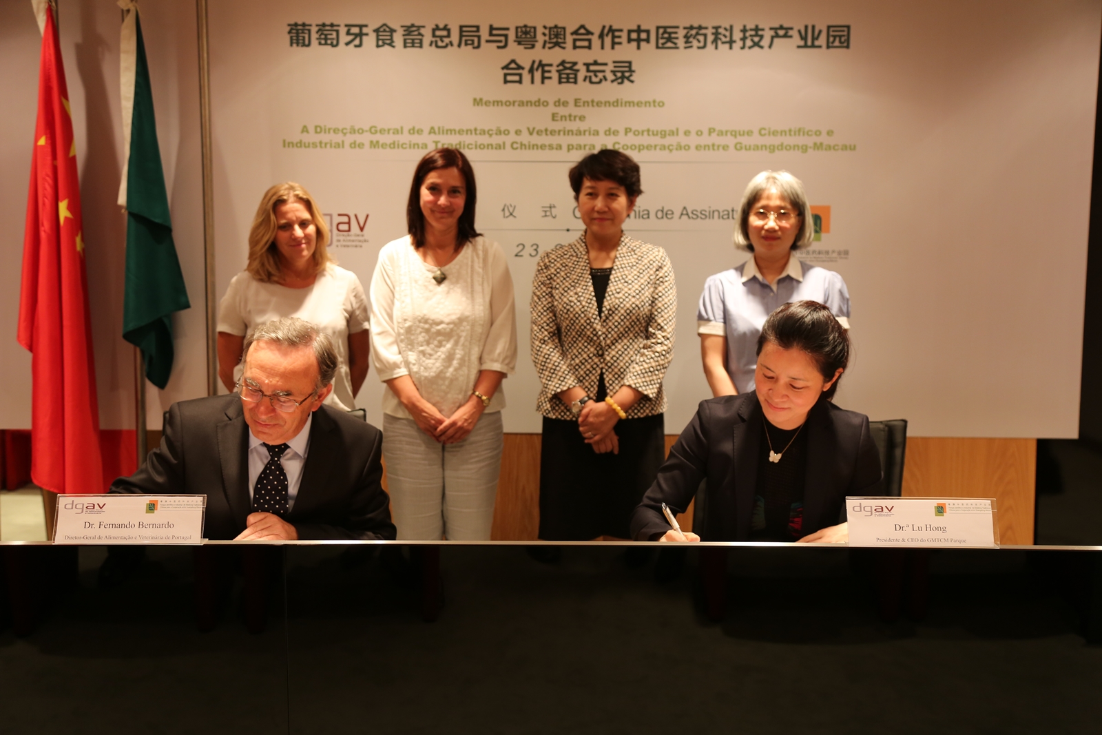 Visando responder ao apelo da estratégia de “Uma Faixa, Uma Rota” da China, e promover o intercâmbio e a cooperação entre a China e os países lusófonos no âmbito de medicina tradicional, como também a divulgação da cultura da Medicina Tradicional Chinesa (MTC), realizou-se, na Delegação Económica e Comercial de Macau em Lisboa, o Seminário de Promoção Ultramarino (Portugal) do Parque Científico e Industrial de Medicina Tradicional Chinesa para a Cooperação entre Guangdong-Macau (adiante designado por GMTCM Parque) do Governo da Região Administrativa Especial de Macau (RAEM) no dia 22 de setembro. Durante o seminário, o GMTCM Parque assinaram memorandos de entendimento com a Direção-Geral de Alimentação e Veterinária de Portugal (DGAV) e a Associação Portuguesa de Suplementos Alimentares (APARD), estabelecendo assim uma plataforma para o intercâmbio e cooperação internacional na área de medicina tradicional e lançando base sólida para a internacionalização da indústria da MTC. O seminário foi organizado pelo GMTCM Parque, obtendo coordenação do Instituto de Medicina Tradicional de Portugal (IMT) e da Sociedade Portuguesa de Fitoquímica e Fitoterapia (SPFito) e contando com pleno patrocínio de relativos departamentos governamentais, nomeadamente a Administração Estatal de Medicina Tradicional Chinesa da República Popular da China, a Embaixada da República Popular da China em Portugal, a DGAV, a Delegação Económica e Comercial de Macau em Lisboa e os Serviços de Saúde de Macau. Cerca de 100 convidados assistiram ao evento, incluindo a Diretora-Geral do Departamento de Cooperação Internacional da Administração Estatal de Medicina Tradicional Chinesa, Sra. Wang Xiaopin, a Assessora do Gabinete do Secretário para a Economia e Finanças da RAEM e ao mesmo tempo Presidente do GMTCM Parque, Sra. Lu Hong, a Conselheira da Seção Económica e Comercial da Embaixada da República Popular da China em Portugal, Sra. Xu Weili, o Diretor-Geral da Saúde de Portugal (DGS), Sr. Francisco George, a Chefe da Delegação Económica e Comercial de Macau em Lisboa, Sra. O Tin Lin, o Chefe do Departamento dos Assuntos Farmacêuticos e também membro do Conselho de Administração do GMTCM Parque, Sr. Choi Peng Cheong, membro do Conselho de Administração do GMTCM Parque, Sr. Tian Wei, e membro do Grupo da MTC da Comissão da Farmacopeia Europeia da Comissão Europeia, Sra. Wang Mei. Apesar das figuras importantes, no seminário ainda estavam presentes representantes provenientes de DGAV, Autoridade Nacional do Medicamento e Produtos de Saúde I.P. (Infarmed.I.P.), APARD, locais instituições académicas de medicina, instituições de formação em MTC, agentes de medicamentos fitoterápicos e de suplementos alimentares e associações da indústria da MTC, etc. Para além disso, ainda se expõem no seminário 17 espécies de produtos, sobretudo medicamentos à base de plantas e suplementos alimentares, produzidas por 6 fábricas de Macau e da China Continental. No seminário de promoção, a Sra. Lu Hong, Presidente do GMTCM Parque, fez uma apresentação sobre trabalhos do Parque, tais como a construção de Plataforma de Serviços Públicos, a exploração do intercâmbio e da colaboração internacional e o progresso de atração de investimentos. E depois, foi o Diretor-Geral da DGS que apresentou a história do desenvolvimento de medicina tradicional em Portugal e a situação de legislação portuguesa relativa à MTC. Ambos os lados mostraram a vontade de consolidar e aprofundar a cooperação sino-portuguesa na área de medicina tradicional. Em seguida, a Sra. Wang Xiaopin, Diretora-Geral do Departamento de Cooperação Internacional da Administração Estatal de Medicina Tradicional Chinesa, referiu que, nos últimos anos, o governo da China tem prestado muita atenção à internacionalização da MTC na qual já obteve êxito estrondoso. O governo também reconheceu os esforços e as tentativas que Macau fez para promover o desenvolvimento da MTC. Por fim, a Diretora-Geral deu uma proposta: o governo da RAEM podia aproveitar o seminário para reforçar a cooperação com os países lusófonos nas áreas de clínica, investigação e ensino da MTC, tirando também proveito da plataforma de Macau. Ainda se realizaram discursos programáticos, no que diz respeito a “a situação do desenvolvimento da MTC em Macau”, “o papel do GMTCM Parque como plataforma para a promoção da internacionalização da MTC” e “Cooperação Internacional em MTC, Macau como Plataforma”, proferidos respetivamente pelo Sr. Choi Peng Cheong, Chefe do Departamento dos Assuntos Farmacêuticos dos Serviços de Saúde da RAEM, pelo Sr. Xie Yi, Vice-Presidente do Parque e pelo Sr. Frederico Carvalho, Diretor Executivo do IMT. Dutante o seminário, o GMTCM Parque assinou, separadamente, memorandos de entendimento com a DGAV e a APARD, com vista a promover o intercâmbio e a cooperação, não só no âmbito de promoção e de comércio de suplementos alimentares, mas também na indústria da saúde, especialmente na promoção e nos negócios de suplementos alimentares, consolidando a base para que o Parque possam iniciar serviços de registo e negócios de suplementos alimentares em relação em Portugal e na União Europeia. Além disso, a delegação do GMTCM Parque fez visitas especiais a dirigentes de alto nível da DGS e da Infarmed. Depois de discussões, chegaram ao concenso do conteúdo e do tempo da assinatura de memorandos. A delegação visitou também a Escola de Medicina Tradicional Chinesa de Lisboa e o IMT, tendo como objetivo conhecer a situação do ensino e do desenvolvimento do emprego local de formações relacionadas com a MTC. Os delegados do Parque ainda experimentaram massagens feitas pelos médicos ocidentais da MTC. O GMTCM Parque esperava que esta visita ajudasse a construir, mais profundamente, a plataforma de cooperação e interc