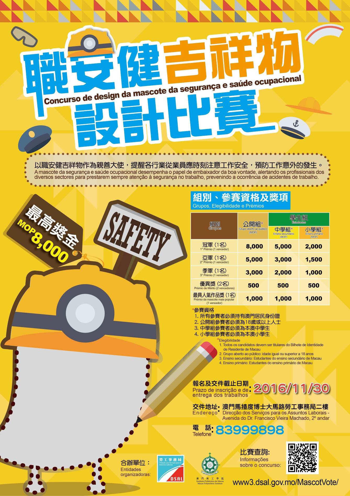 Para relembrar aos cidadãos que devem estar sempre atentos à segurança e saúde ocupacional, a Direcção dos Serviços para os Assuntos Laborais (DSAL) e o Instituto Politécnico de Macau (IPM) organizam em conjunto o “Concurso de design da mascote da segurança e saúde ocupacional”, encorajando os cidadãos a usarem a sua criatividade na concepção da mascote, a fim de divulgar amplamente as informações sobre segurança e saúde ocupacional.