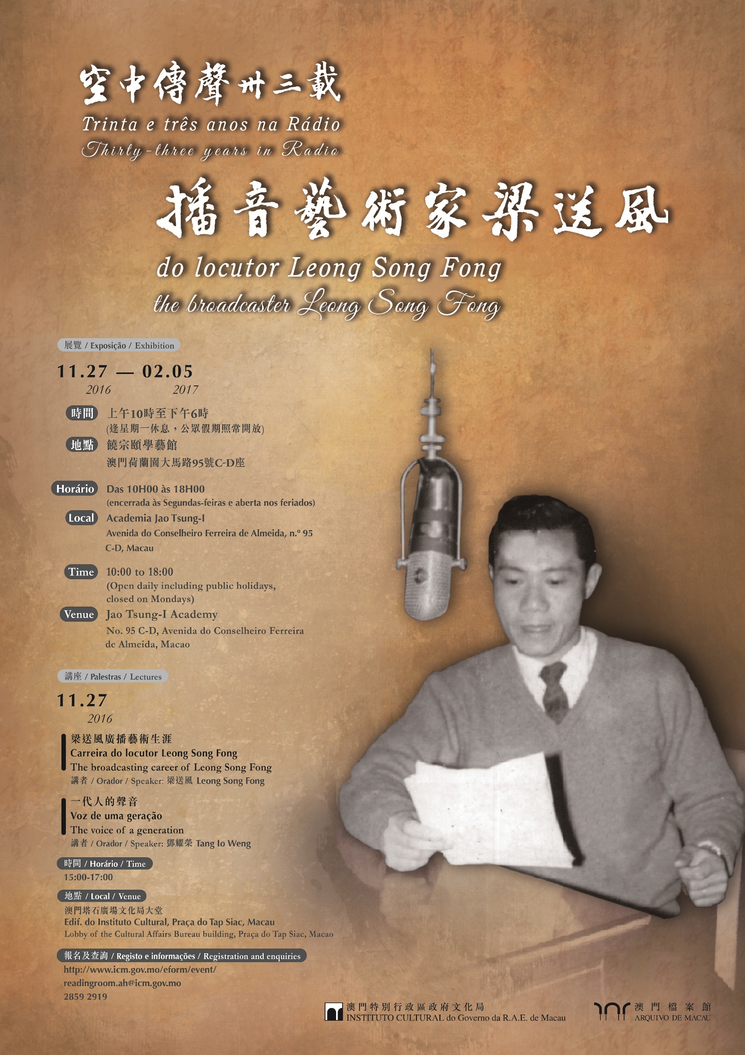 A exposição "Trinta e três anos na rádio - do locutor Leong Song Fong" divide-se em três partes: biografia, carreira do locutor e colegas e amigos. As valiosas fotografias, objectos e materiais multimédia, entre outras informações, cedidas por Leong Song Fong, permitem ao público conhecer a sua carreira de locutor durante trinta e três anos e o seu sucesso, bem como as suas diversas interpretações em numerosos programas radiofónicos. A exposição estará patente ao público entre 27 de Novembro de 2016 e 5 de Fevereiro de 2017, na Academia Jao Tsung-I.