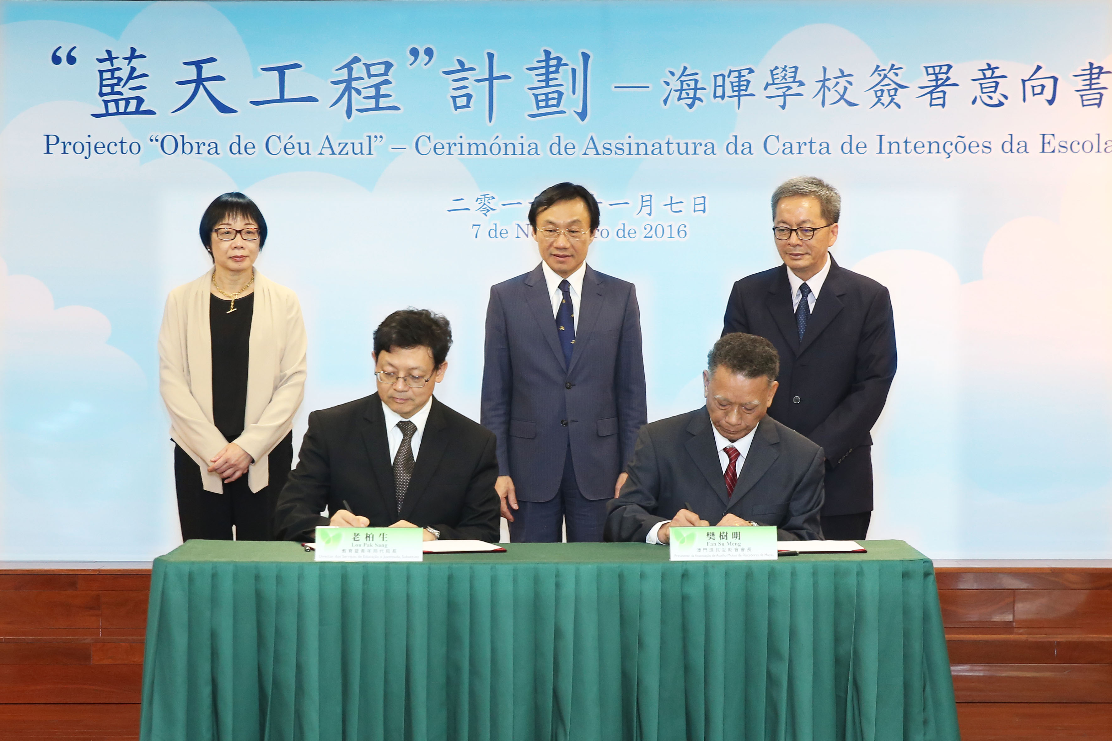 No dia 7 de Novembro de 2016, Lou Pak Sang, director substituto da Direcção dos Serviços de Educação e Juventude e Fan Su Meng, presidente da Associação de Auxílio Mútuo de Pescadores de Macau, entidade titular da Escola Hói Fai, assinaram a Carta de Intenções sobre a participação da referida escola no projecto “Obra de Céu Azul”. A ocasião foi testemunhada pelo Secretário para os Assuntos Sociais e Cultura, Alexis, Tam Chon Weng. A associação aceitou a reconstrução da actual Escola Primária Luso-Chinesa do Bairro Norte para ser o novo edifício escolar da Escola Hói Fai.