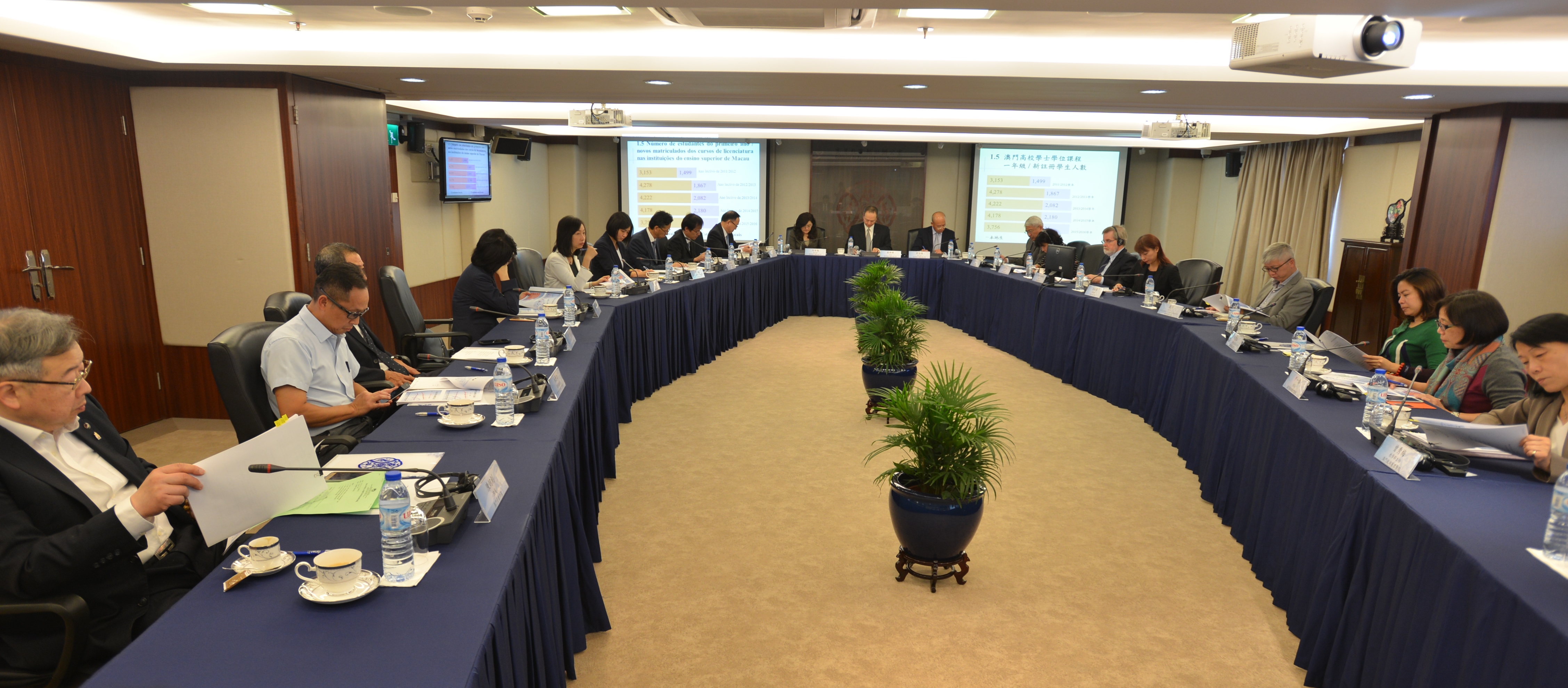 Na reunião, o GAES apresentou os dados estatísticos mais recentes na área do ensino superior. Nos últimos anos, o número de pessoal docente, a tempo inteiro, das instituições do ensino superior mostra uma tendência ascendente, sendo de 1391 docentes no ano lectivo 2015/2016, representando 69% do número total do pessoal docente; o número de pessoal docente que possui grau de doutoramento também continua a crescer, de 627 docentes, no ano lectivo 2011/2012, para 959 docentes, no ano lectivo 2015/2016, o que representa um aumento de 10%. Quanto ao número de estudantes matriculados nas instituições do ensino superior de Macau, foi no total 31.970 estudantes; as maiores áreas profissionais nas quais os estudantes estudam são “Comércio e Gestão” e “Turismo e Serviços de Entretenimento”, o que representa cerca de 49% do número total de estudantes.