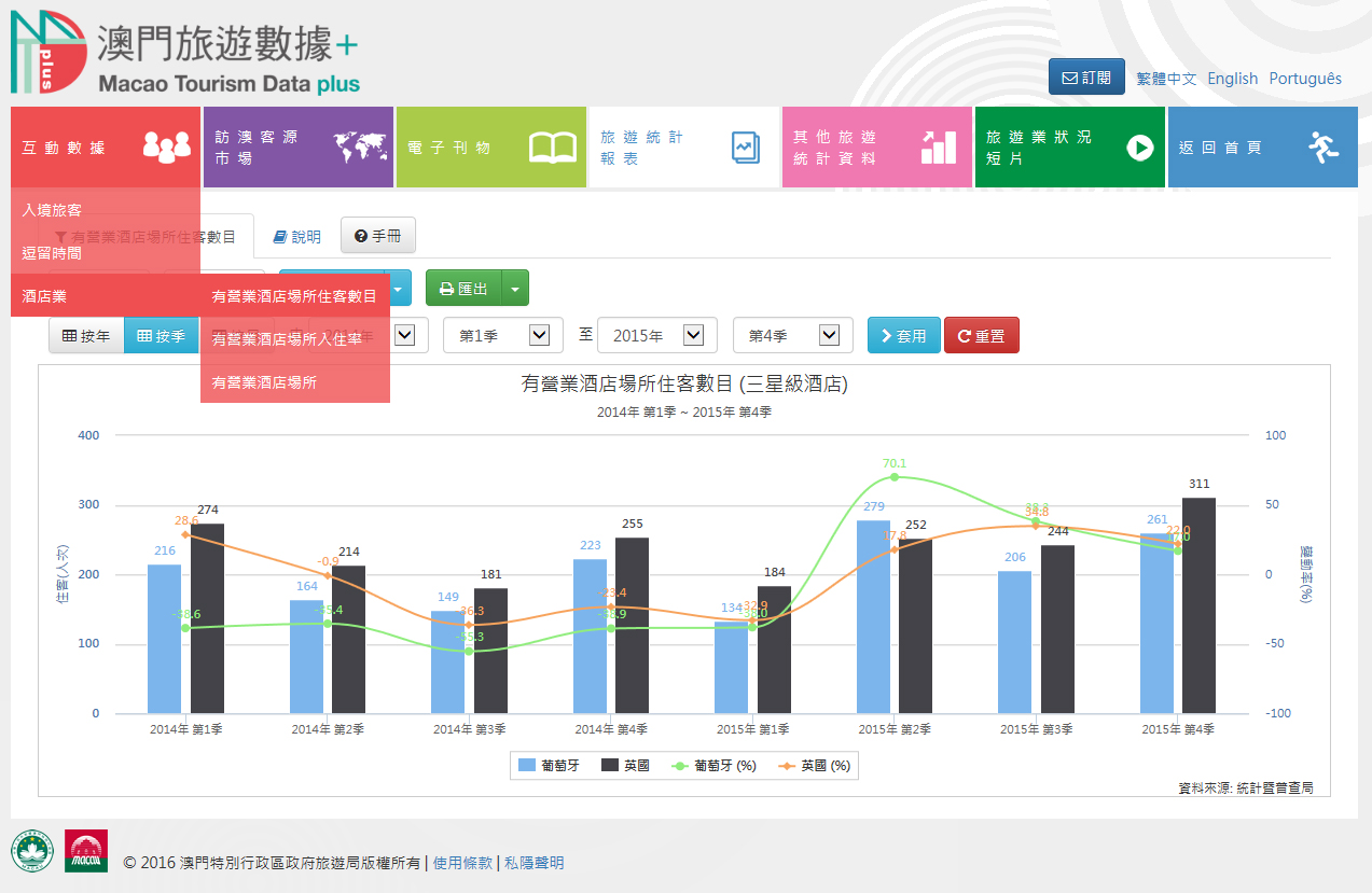 Para permitir aos utilizadores usufruir de um serviço do governo que permita o rápido acesso às diferentes estatísticas de turismo num só local, a DST lançou no final de Novembro do ano passado a plataforma com estatísticas e dados de turismo Macao Tourism Data plus (MTD plus). No seguimento da adição em Agosto deste ano da versão em português, da função de subscrição e do manual da plataforma, esta fase acrescenta agora, na função de dados interactivos, três indicadores de estatísticas da actividade da indústria hoteleira.