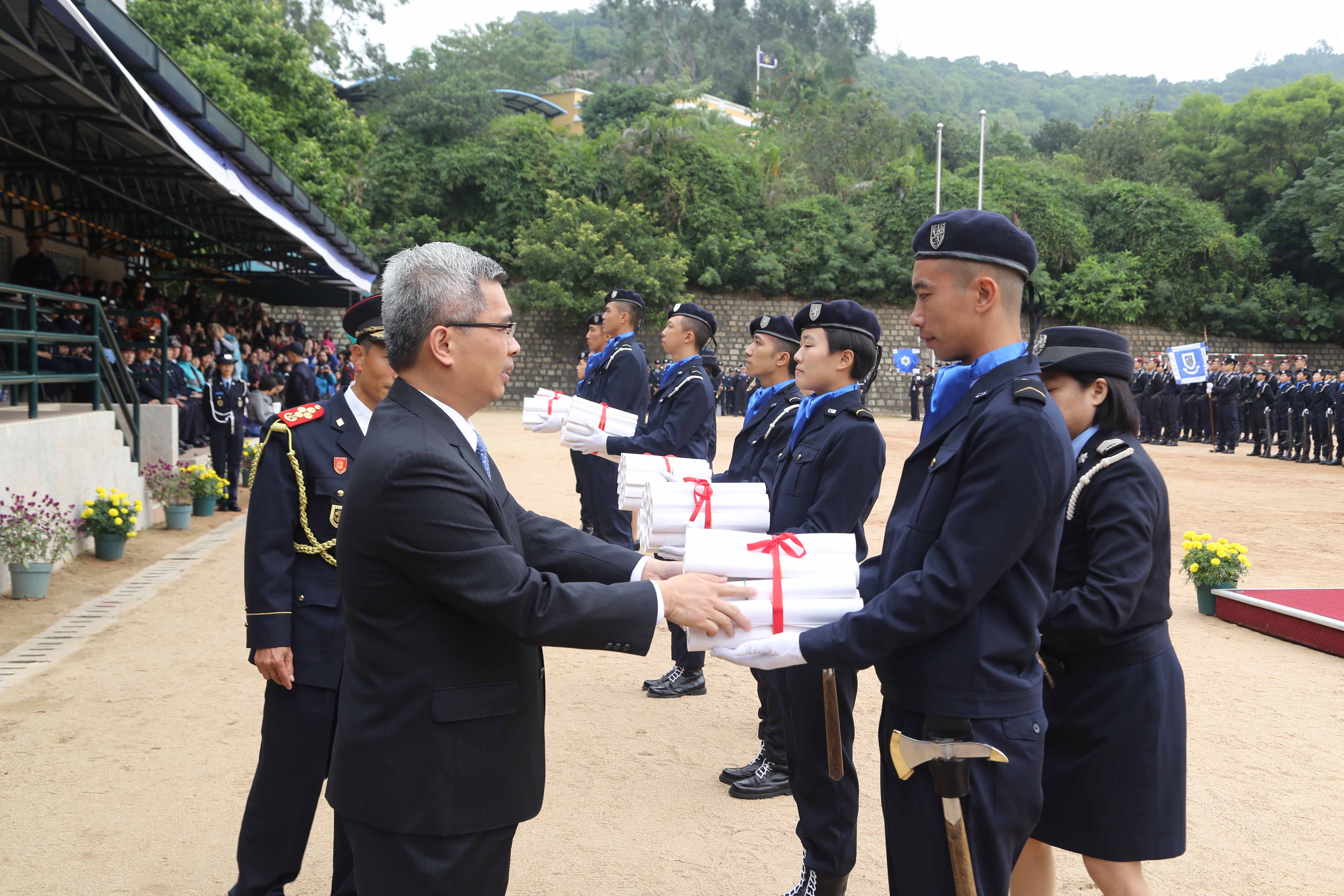 Na alocução, o Director disse que, nos últimos dezasseis anos que se seguiram a criação do Governo da Região Administrativa Especial de Macau, durante estes anos, a sociedade têm vindo sucessivamente a desenvolver-se e o ambiente de segurança da sociedade tem-se tornado cada vez mais complicado, verificando-se uma maior exigência da população em relação ao Corpo de Polícia de Segurança Pública e ao Corpo de Bombeiro. Os instruendos devem ser disciplinados antes de serem disciplinadores, e em qualquer situação futura, devem agir segundo a norma de conduta de serem incorruptíveis e seguidores das leis, e os trabalhos das Forças de Segurança são muito árduos mas significativos. Na ocorrência de calamidades, sem hesitarem arriscar a própria vida, devem enfrentar as dificuldades e proteger, prioritariamente, a vida e bens dos cidadãos. Têm de saber que são trabalhadores na linha da frente e devem prestar apoio aos cidadãos que precisam de ajuda de forma mais rápida e directa, a fim de aliviar instantaneamente seu sofrimento. Estimulou, ainda, os instruendos que terão, pela frente, um longo caminho a percorrer, poderão ultrapassar todos os desafios que surgirem no futuro com destemor e espírito de perseverança monstrado durante a instrução.