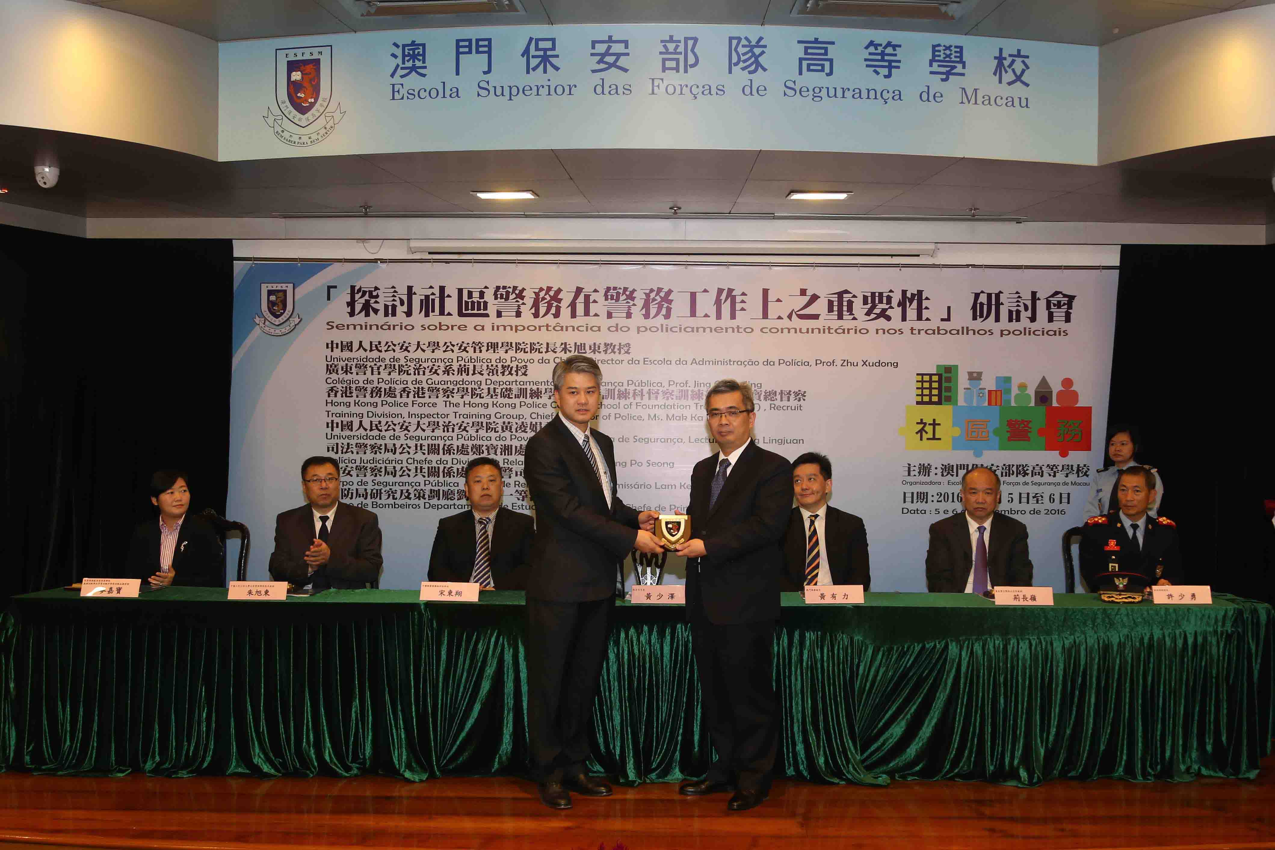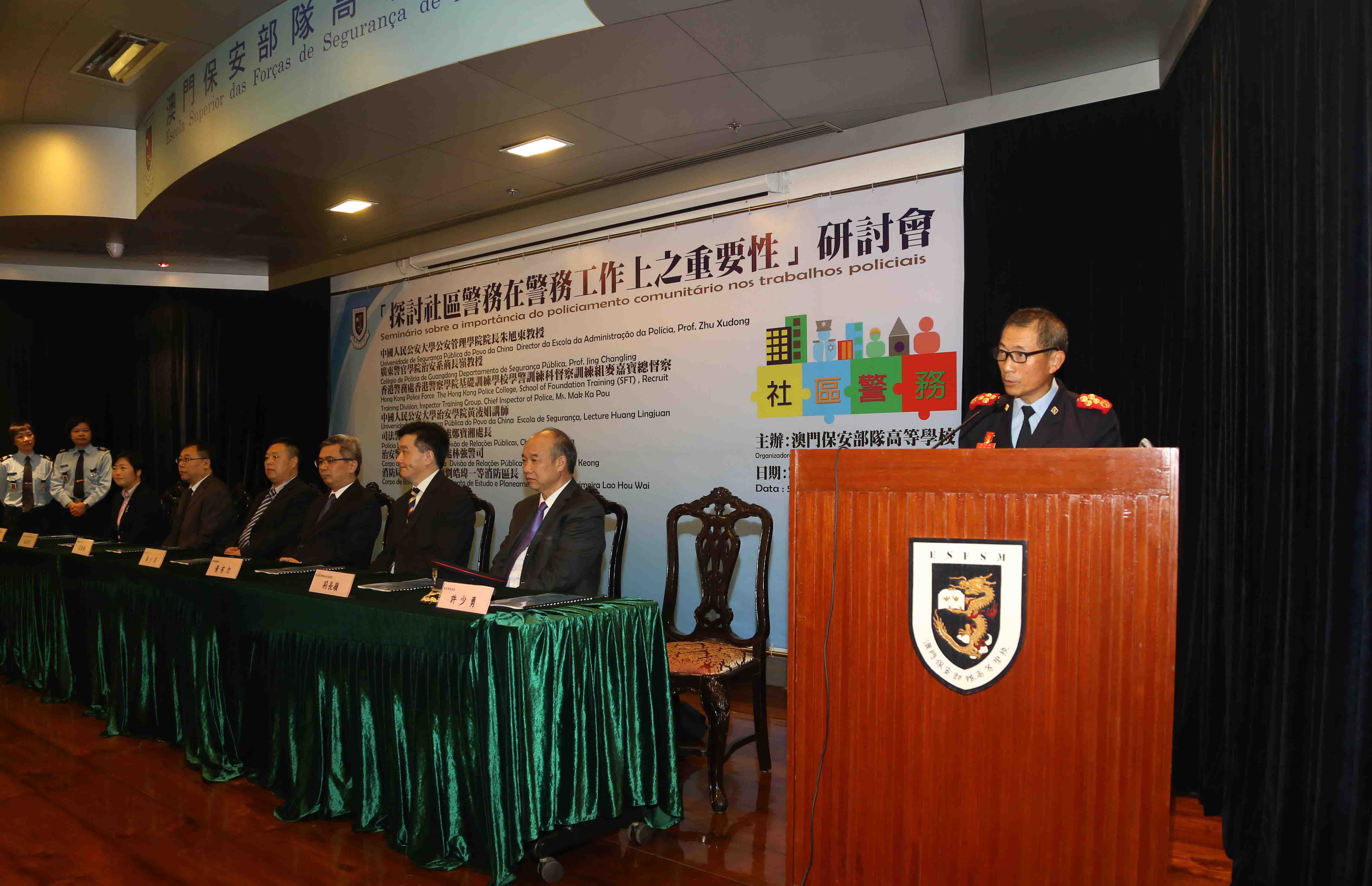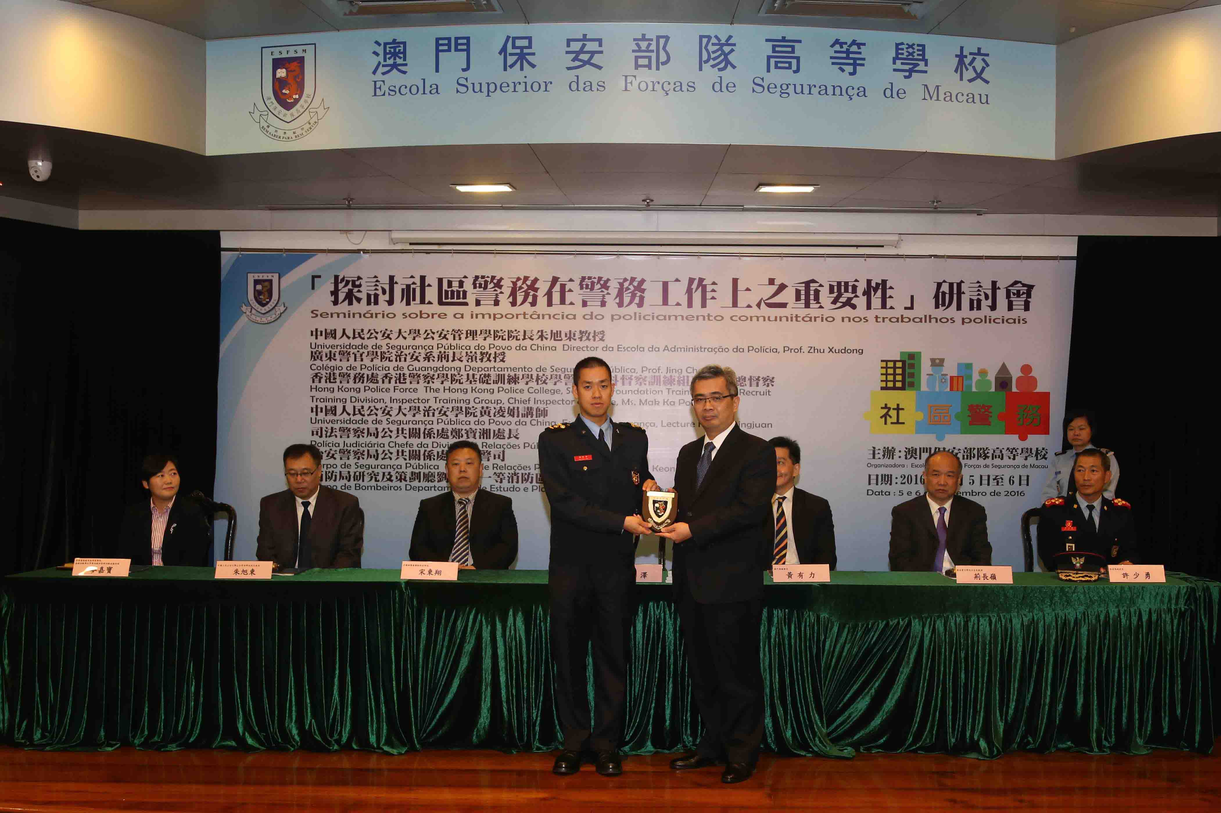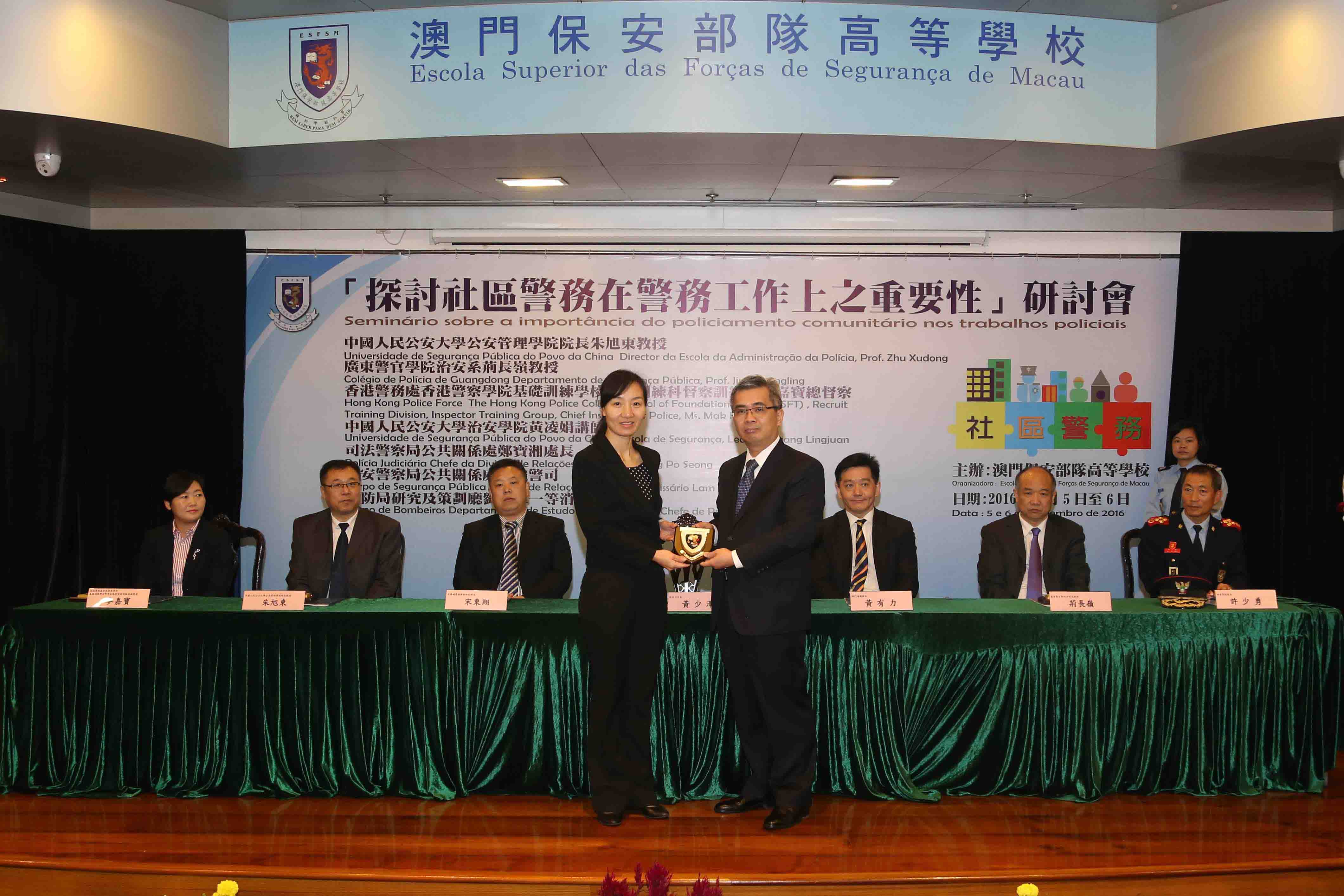 O seminário foi realizado em dois dias, no primeiro dia, o Prof. Zhu Xudong, Director da Escola da Administração da Polícia da Universidade de Segurança Pública do Povo da China, Ms. Mak Ka Po, The Hong Kong Police College, School of Foundation Training (SFT) , Recruit Training Division, Inspector Training Group, Chief Inspector of Police of Hong Kong Police Force, o Prof. Jing Changling, Departamento de Segurança Pública do Colégio de Polícia de Guangdong, Cheang Pou Seong, Chefe da Divisão de Relações Públicas da Polícia Judiciária, proferiram respectivamente os seguintes temas: “Estudo inovador do policiamento comunitário chinês sob ponto de vista de administração de sociedade”, “Importância do policiamento comunitário nos trabalhos policiais de Hong Kong”, “Actualidade e desenvolvimento futuro do policiamento comunitário de Guangdong”, “A importância do policiamento comunitário nos trabalhos policiais”. No segundo dia, a Lecture Huang Lingjuan, Escola de Segurança da Universidade de Segurança Pública do Povo da China, o Comissário Lam Keong, Divisão de Relações Públicas do Corpo de Segurança Pública, o Chefe de Primeira Lao Hou Wai, Departamento de Estudo e Planeamento do Corpo de Bombeiros, proferiram respectivamente os seguintes temas: “A Posição e função do policiamento comunitário nos modernos trabalhos policiais”, “Desenvolvimento e prática do policiamento comunitário do CPSP”, “Importância do policiamento comunitário nos trabalhos de bombeiros”. Através de abordagem em conjunto e troca de conhecimentos teóricos e experiências práticas no policiamento comunitário entre três lugares, pretende-se que os agentes policiais se reforçem por entender a importância de "policiamento comunitário" no trabalhos policiais, de modo que os trabalhos policiais produzam maiores efeitos na comunidade.