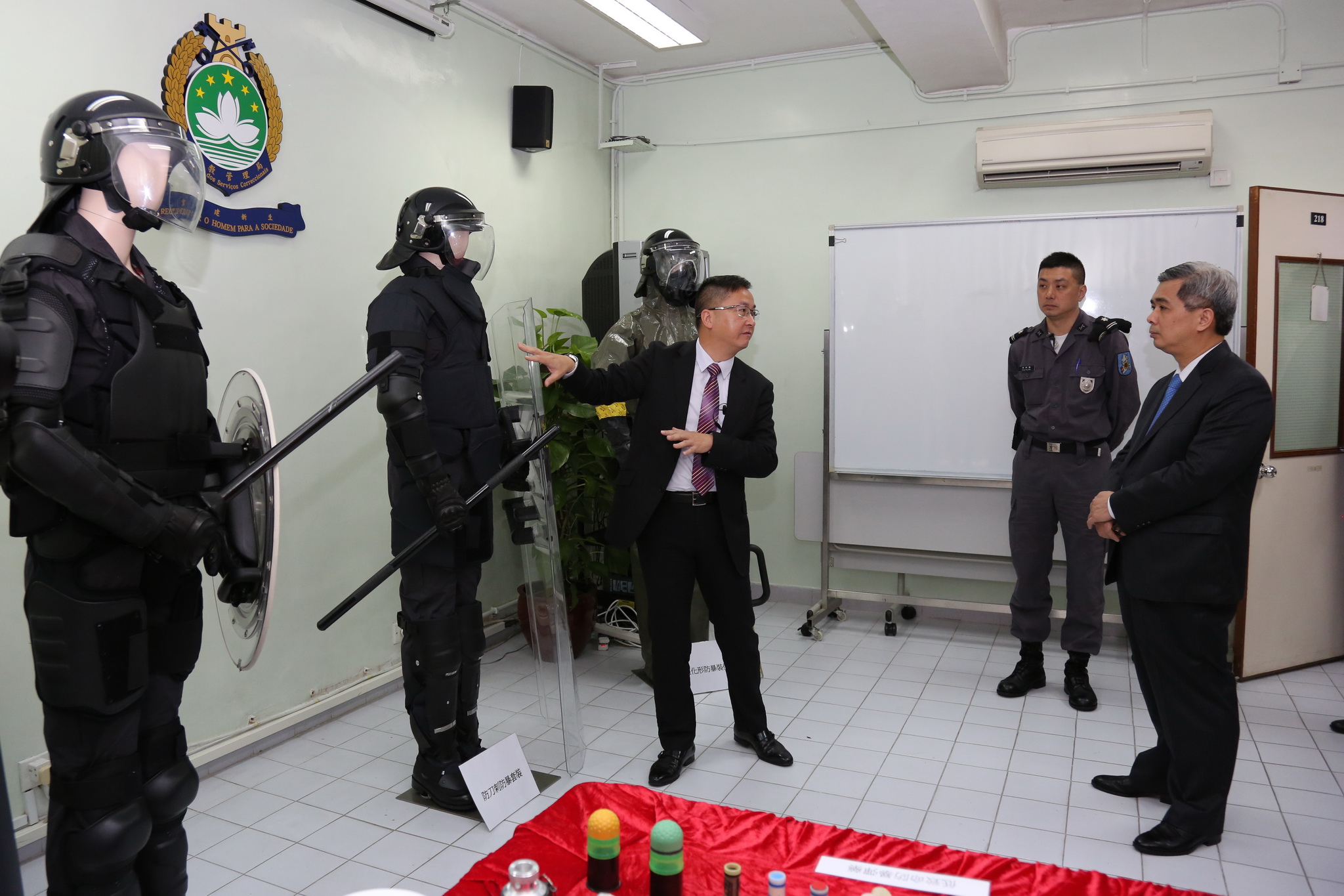 Em seguida, o Secretário para a Segurança, Wong Sio Chak, acompanhado do director da DSC, Cheng Fong Meng, procedeu à inspecção dos equipamentos de trabalho dos guardas e à observação da simulação anti-motim apresentada pelo Grupo de Intervenção Táctica. Além disso, o Secretário para a Segurança, Wong Sio Chak, acompanhado da directora do Instituto de Menores, Yu Pui Lam, visitou as instalações do IM para compreender o progresso na reparação das diversas instalações e a situação de melhoramento do ambiente de trabalho do pessoal.