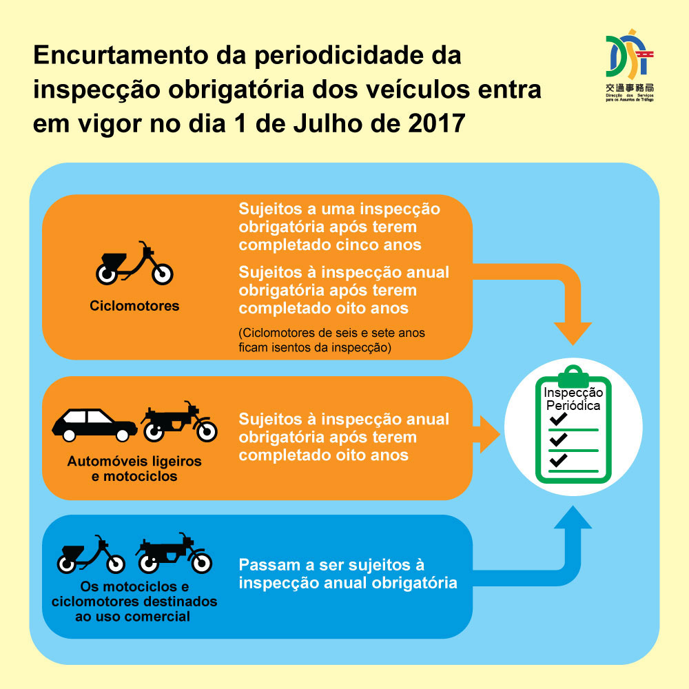Com o disposto no n.º 2 do artigo 50.º da nova redacção do Regulamento do Trânsito Rodoviário a entrar em vigor no dia 1 de Julho de 2017, a inspecção anual obrigatória para automóveis ligeiros e motociclos passa a iniciar-se ao fim do oitavo e não do décimo ano. Quanto aos ciclomotores, estes passam a ser sujeitos a uma inspecção obrigatória ao fim do quinto ano e à inspecção anual obrigatória desde o fim do oitavo ano, no entanto, os ciclomotores de seis e sete anos ficam isentos da inspecção obrigatória do corrente ano. Com a nova redacção, os motociclos e ciclomotores destinados ao uso comercial passam a ser sujeitos à inspecção anual obrigatória. A nova disposição visa controlar a emissão dos gases de escape, promover a manutenção periódica dos veículos e elevar a segurança dos veículos em circulação.