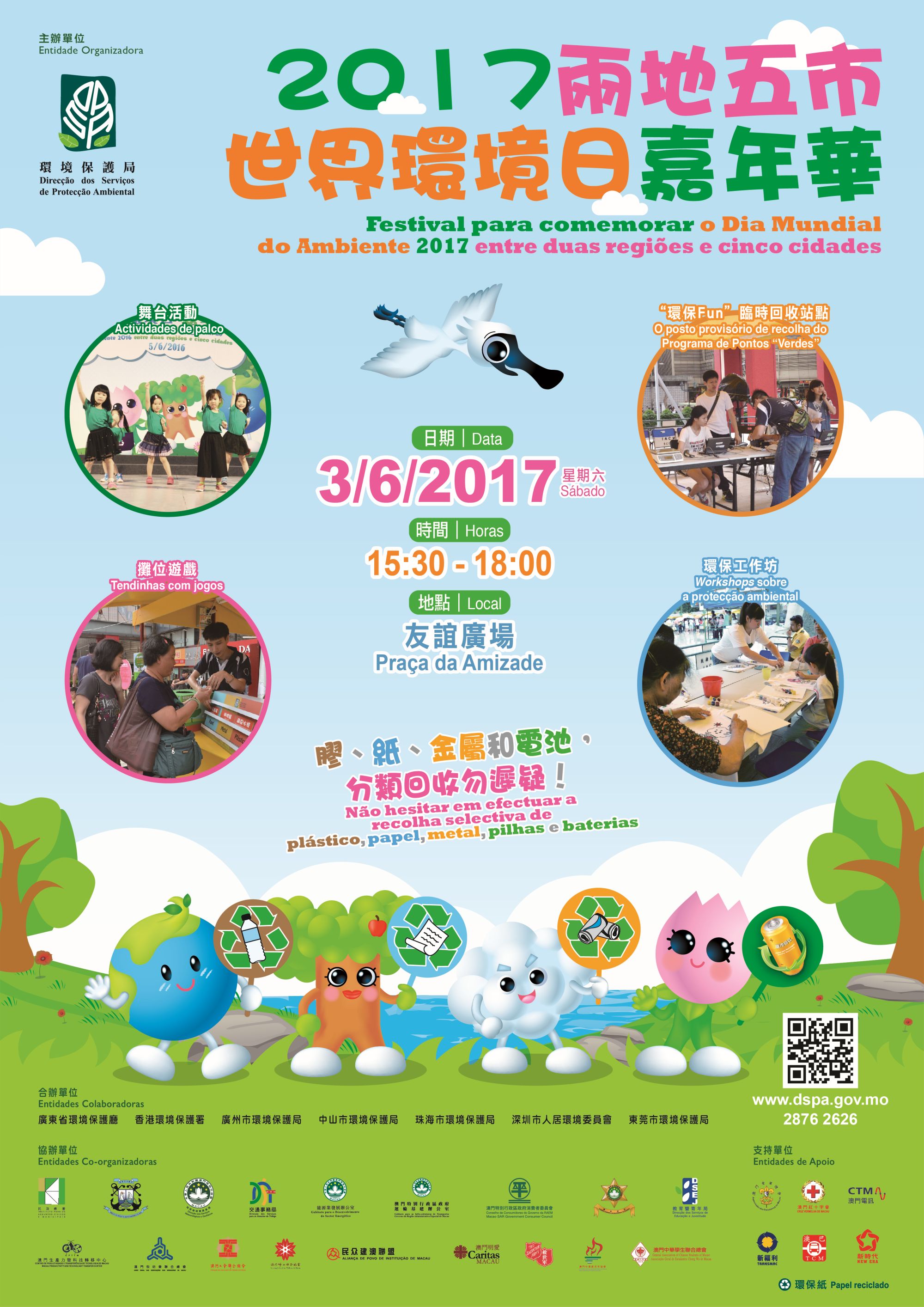 O “Festival para comemorar o Dia Mundial do Ambiente 2017 entre duas regiões e cinco cidades”, organizado pela Direcção dos Serviços de Protecção Ambiental (DSPA) terá lugar amanhã (dia 3), pelas 15h30, na Praça da Amizade. Esta iniciativa tem como objectivo reunir todos os esforços dos sectores a fim de estimular a recolha selectiva para reduzir os resíduos. Também se proporcionam actividades ricas neste festival e todos são bem-vindos a participar no evento.