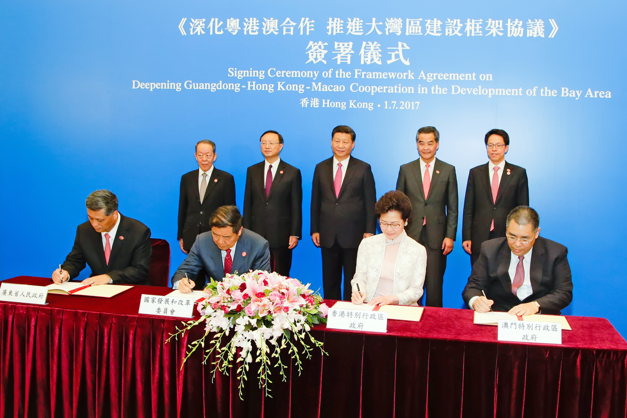 O presidente Xi Jinping testemunhou, esta manhã (1 de Julho), no Centro de Convenções e Exposição de Hong Kong, a celebração do «Acordo-Quadro para o reforço da cooperação Guangdong - Hong Kong - Macau e promoção da construção da Grande Baía», assinado pelo Chefe do Executivo da Região Administrativa Especial de Macau, Chui Sai On, Chefe do Executivo da Região Administrativa Especial de Hong Kong, Carrie Lam, director da Comissão Nacional para o Desenvolvimento e Reforma, He Lifeng, e o governador da Província de Guangdong, Ma Xingrui, em nome dos respectivos governos.
