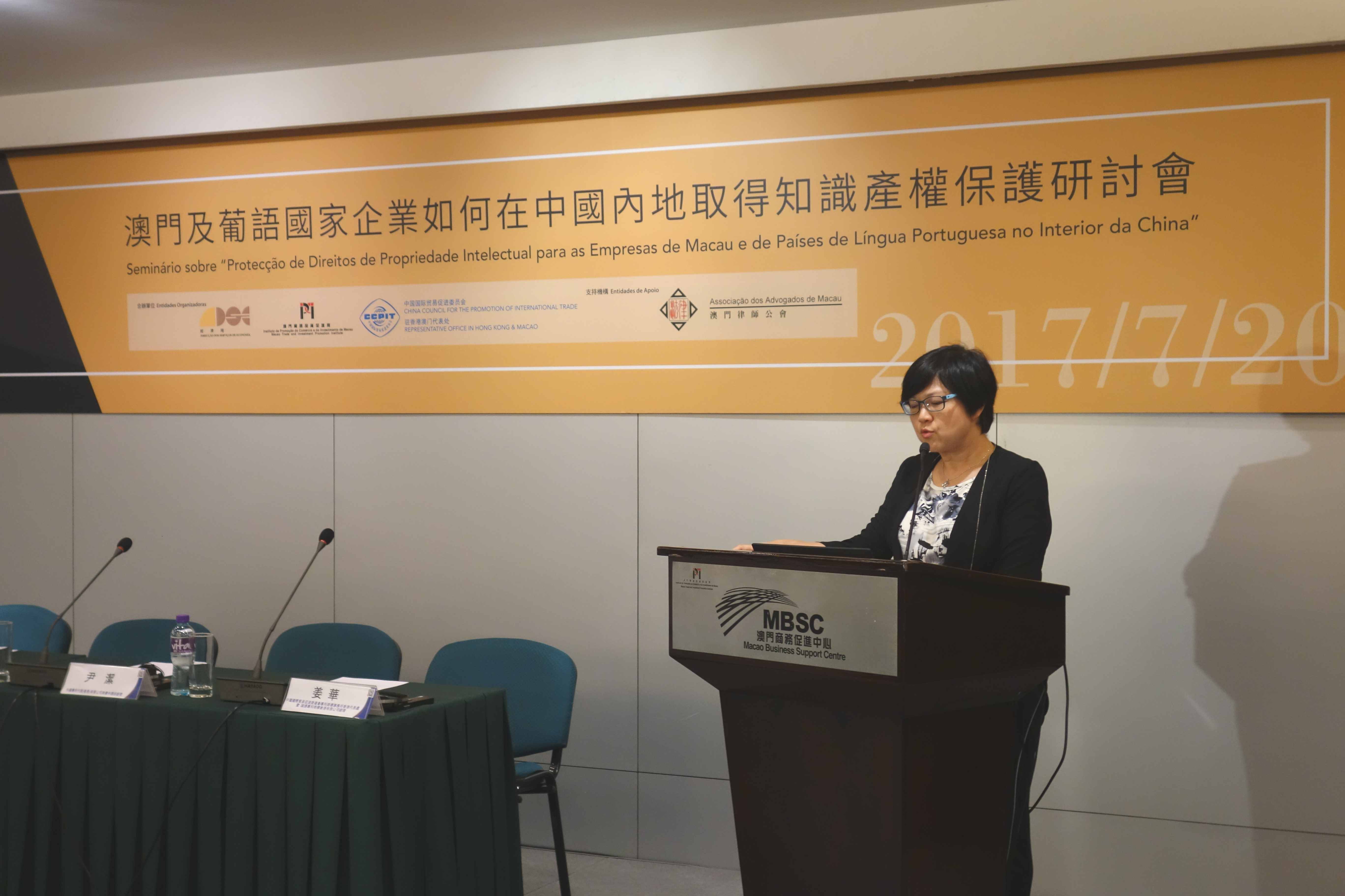 Na sua intervenção, a Vogal Executiva do IPIM, Dra. Glória Batalha Ung, referiu que, tanto no relatório do governo como no 13.º Plano Quinquenal da República Popular da China, foi mencionado o reforço da protecção dos direitos de propriedade intelectual. Além disso, nos últimos anos, foi continuamente implementado e aprofundado o “Acordo de Estreitamento das Relações Económicas e Comerciais entre o Continente Chinês e Macau” (Acordo CEPA) e dos respectivos acordos suplementares, no intuito de impulsionar os produtos “Fabricados em Macau”, as “Marcas de Macau”, as “Concepções de Macau” e os “Produtos dos Países de Língua Portuguesa com Canais de Distribuição em Macau” a aproveitarem das facilidades proporcionadas pelo Acordo CEPA para entrarem no vasto mercado do Continente Chinês. A par disso, a aceleração da construção da “Plataforma de Serviços para a Cooperação Comercial entre a China e os Países de Língua Portuguesa”, visa também proporcionar mais oportunidades para as empresas locais e dos países de língua portuguesa, representantes das associações comerciais e câmaras de comércio e, bem assim, aos agentes de produtos, a desenvolverem o mercado chinês. A Vogal Executiva Dra. Glória Batalha Ung manifestou desejos de que o referido seminário possa ajudar às empresas transformar as suas ideias inovadoras em direitos de propriedade intelectual, melhorando, por essa via, a competitividade das empresas e dos produtos de marca.