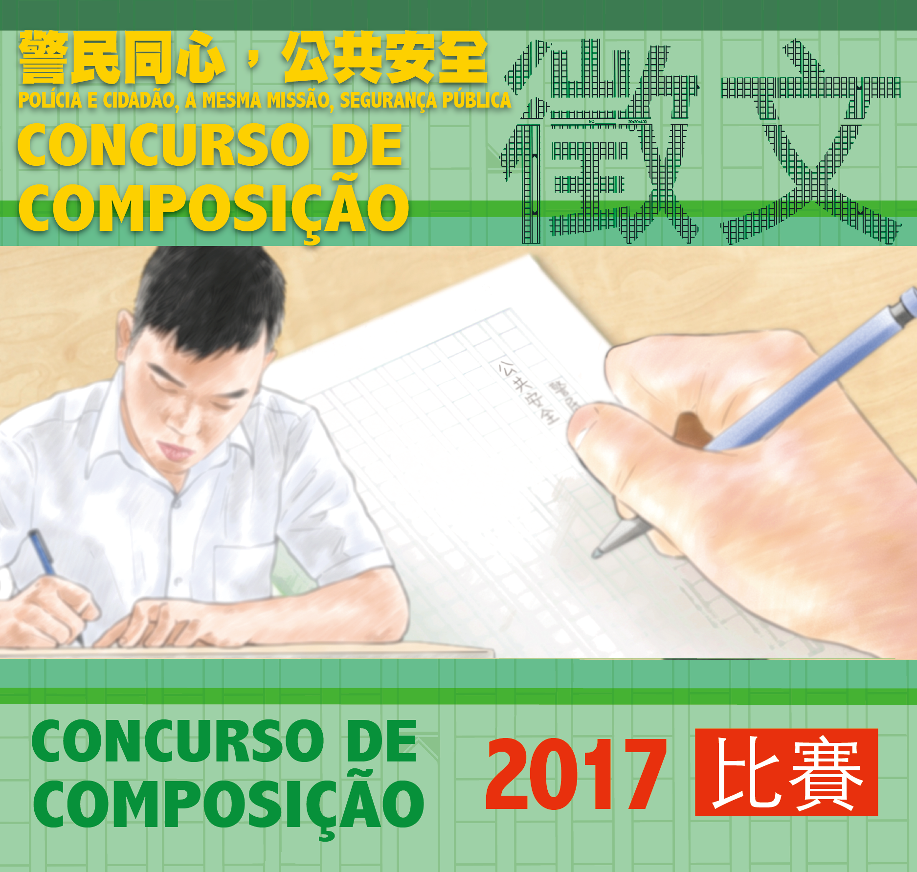 O concurso de composição em língua chinesa, deste ano, é subordinado ao tema “Polícia e Cidadão, a Mesma Missão, Segurança Pública”, os participantes podemos exprimir suas opiniões sobre a cooperação concertada entre polícia e cidadão e os pontos positivos para a segurança pública de Macau; e o concurso de fotografia decorre sob o tema “Polícia - Impressão”, os participantes podem demonstrar a imagem positiva das Forças de Segurança através de fotografias, elevando a sensibilização do público em geral para as Forças de Segurança. Estas actividades são organizadas com a colaboração da Associação da Ciência de Composição Literária de Macau, da Associação Fotográfica de Macau, da Associação de Salão Fotográfico de Macau, da Associação de Fotografia Digital de Macau e do Clube Foto-Artístico de Macau. As inscrições para os concursos terão início a partir de 1 de Agosto de 2017 até 31 de Outubro de 2017.