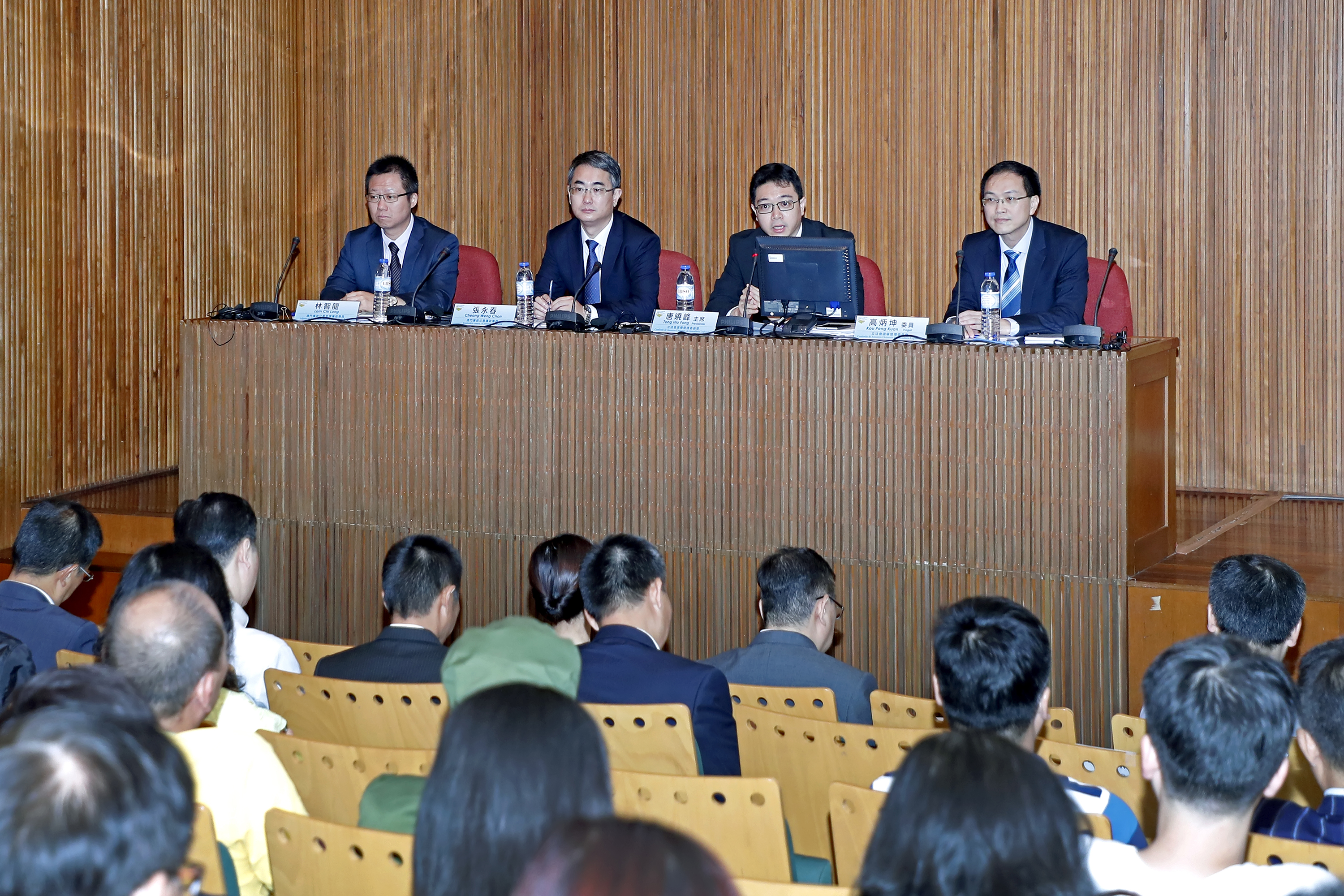 A reunião de trabalho de hoje foi presidida conjuntamente pelo presidente do CAEAL, Tong Hio Fong, pelo comissário do CCAC, Cheong Weng Chon, pelo adjunto do CCAC, Lam Chi Long e pelo vogal da CAEAL, Kou Peng Kuan. O presidente, Tong Hio Fong e o comissário do CCAC, Cheong Weng Chon frisaram que, a reunião de trabalho tem como objectivo principal esclarecer aos mandatários e candidatos as observações na sequência da publicação da relação das candidaturas definitivamente admitidas, evitando violações das disposições da Lei Eleitoral para a Assembleia Legislativa no âmbito de propaganda antecipada e até a corrupção eleitoral. Com efeito, a CAEAL e o CCAC concretizarão a fiscalização e a execução rigorosa da lei, reforçando a campanha de sensibilização e a promoção, com vista a garantir um ambiente justo, imparcial e íntegro durante as eleições legislativas.