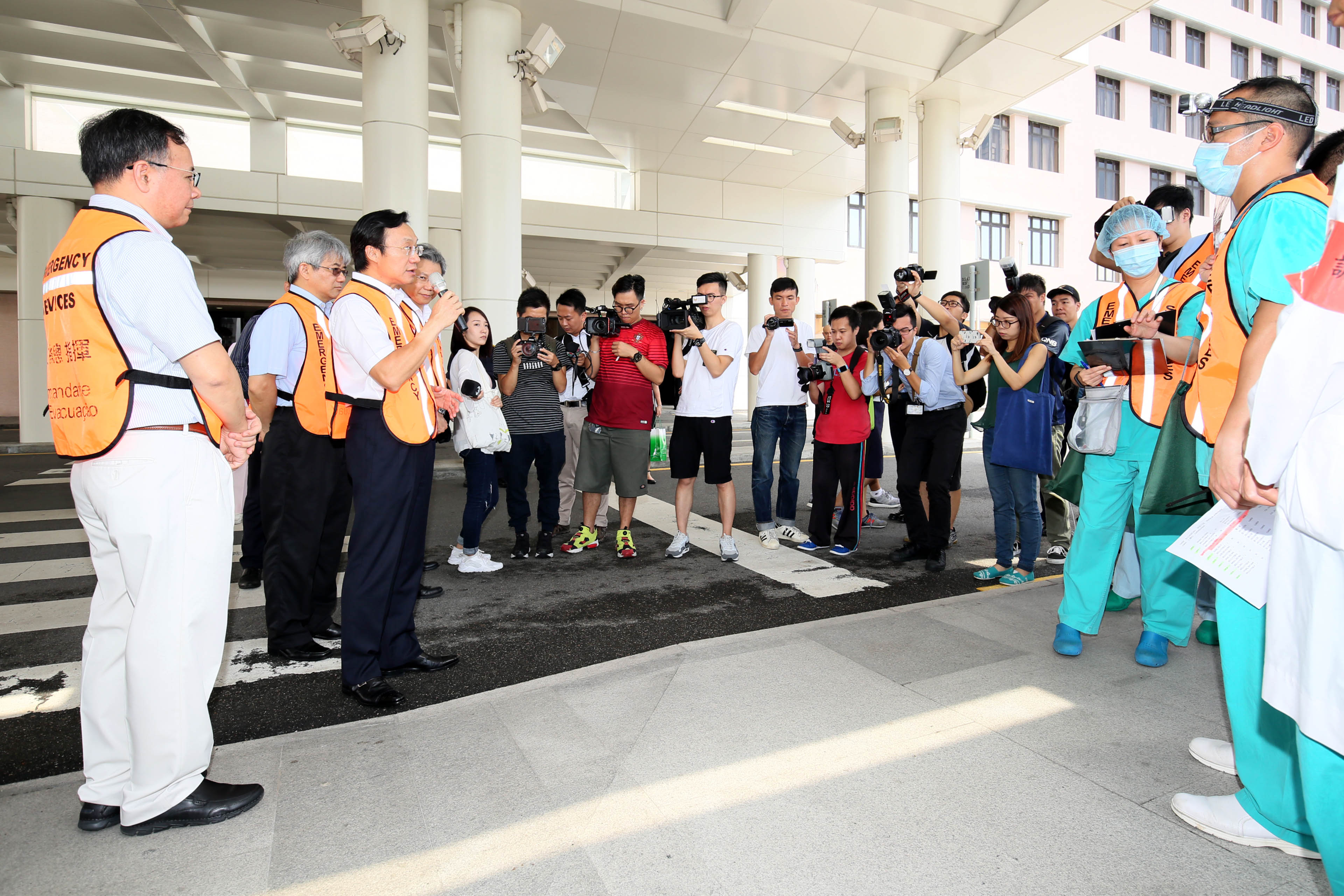 O CHCSJ realizou, hoje (5 de Agosto), em conjunto com o Corpo de Bombeiros (CB), uma simulação de evacuação num incêndio, tendo como objectivo testar a capacidade de resposta do C.H.C.S.J. durante um incêndio. Através da cooperação interdepartamental com o CB, eleva-se a capacidade de resposta do C.H.C.S.J. e o CB durante a ocorrência de incidentes emergentes, de forma a reduzir as mortes e os feridos aquando da ocorrência de desastre. O Secretário para os Assuntos Sociais e Culturais, Dr. Alexis Tam Chon Weng, o Directior dos Serviços de Saúde, Dr. Lei Chin Ion, o Director do CHCSJ, Dr. Kuok Cheong Iu, a Subdirectora, Drª Ho Iok San, o Chefe Substituto da Divisão de Operações e de Ambulâncias de Macau - Corpo de Bombeiros, Sr. Cheong Kin Wa, entre outros estavam presentes para observarem a simulação.