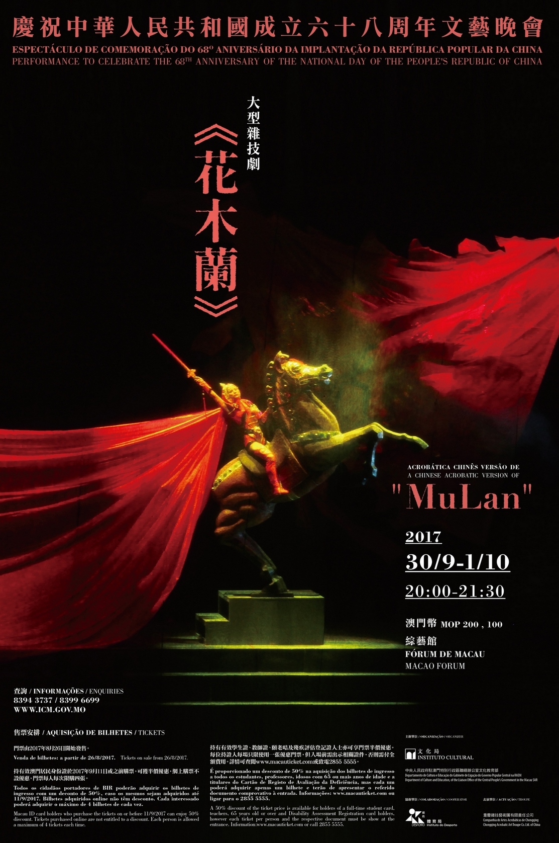 A Companhia de Artes Acrobáticas de Chongqing irá reinterpretar a célebre história da Hua Mulan com os seus extraordinários actos acrobáticos, incutindo um novo vigor nas artes cénicas tradicionais através da fusão da acrobacia e de outras formas típicas de expressão artística chinesa, como dança, kung fu, teatro de sombras e mudança de rosto (Bian Lian), etc.. O espectáculo acrobático Mulan representa a devoção da guerreira pelo seu pai, a lealdade ao país e o espírito destemido de um verdadeiro herói, permitindo ao público desfrutar de uma nova experiência de grande impacto visual que dá vida a cenas de guerra monumentais através dos exigentes e vertiginosos actos acrobáticos da companhia.