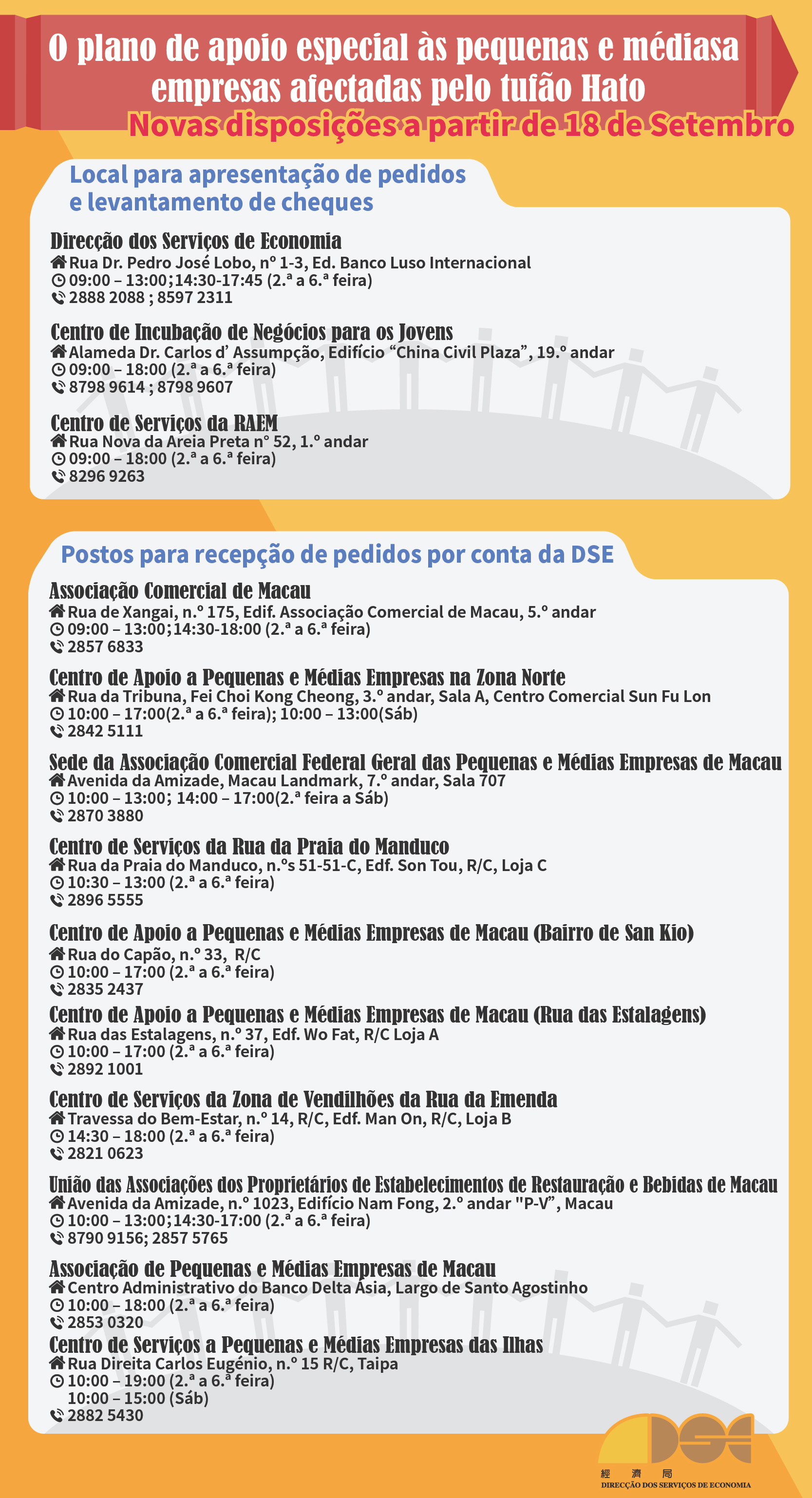 Para facilitar a apresentação, pelas pequenas e médias empresas afectadas, dos pedidos sobre asduas medidas de apoio, a DSE estabelece 3 “Posto de recepção e atribuição do cheque ” e 10 “Posto de recepção dos pedidos”, cujos endereços e horários de funcionamento mais actualizados encontram-se no quadro em anexo. Para qualquer informação, é favor telefonar 2888-2088 ou 6297-9762, ou consultar o Website da DSE ou a conta oficial de Wechat (DSEMACAU).
