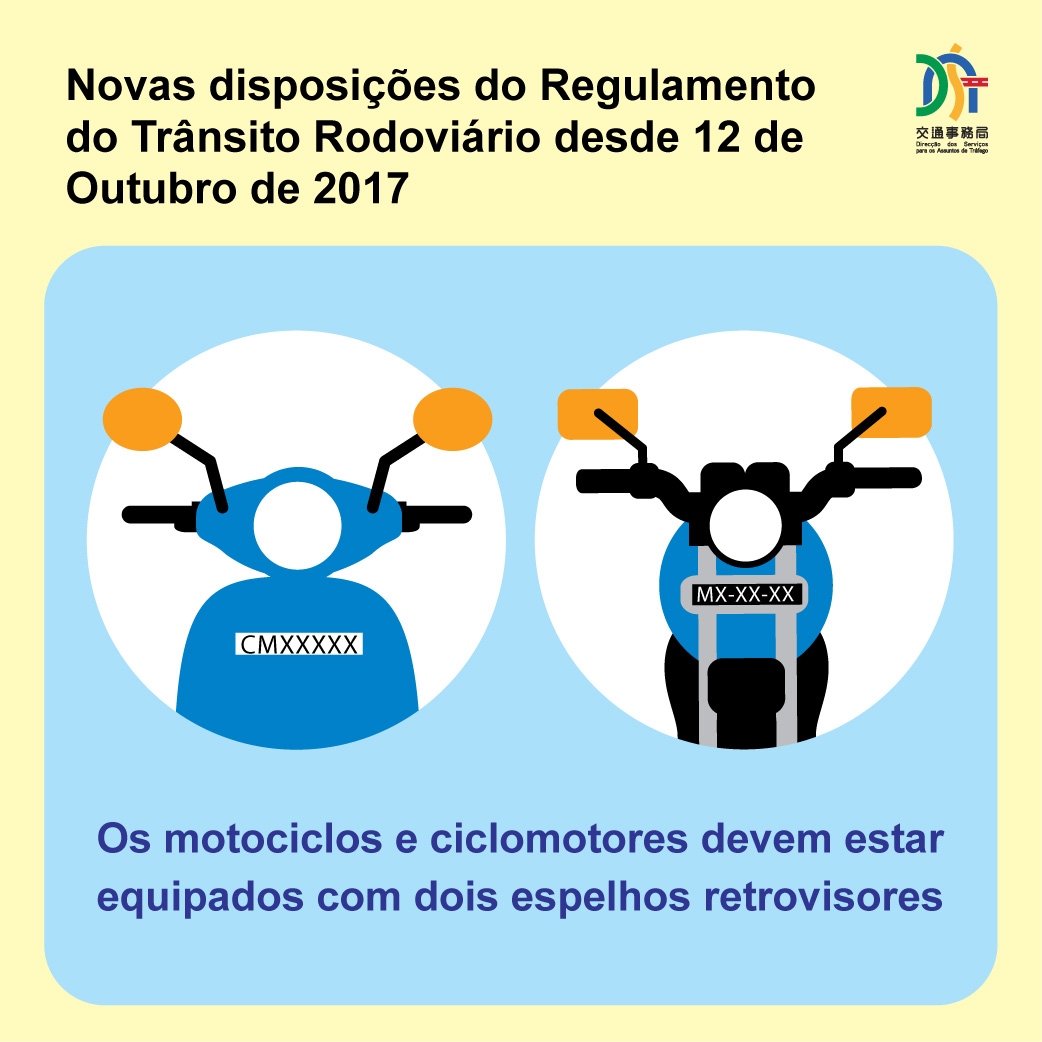 Tendo em consideração a segurança rodoviária, o Governo da RAEM proclamou, no ano passado, o Regulamento Administrativo n.º 24/2016 (Alteração ao Regulamento do Trânsito Rodoviário). O artigo 38.º (Acessórios) estipula que, a partir de 12 de Outubro, os motociclos e ciclomotores devem estar equipados com dois espelhos retrovisores, colocados um no lado direito e outro no lado esquerdo do condutor. Aquele que não cumprir poderá ser punido com a multa de 300 patacas. Além disso, caso se verifique o incumprimento das respectivas especificações durante a inspecção do veículo, o mesmo será sujeito a uma nova inspecção e serão cobradas as respectivas taxas.