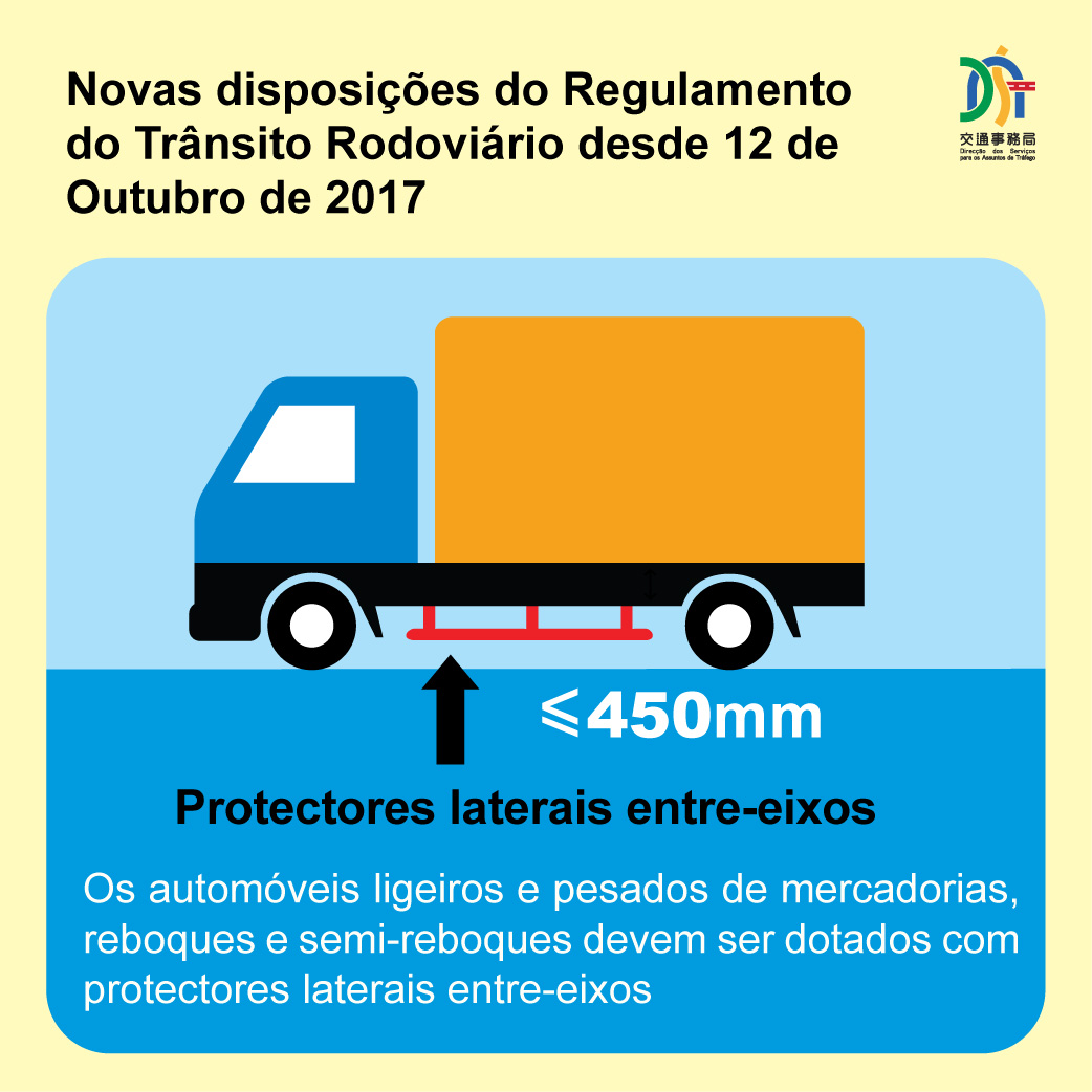 A partir do mesmo dia, todos os automóveis ligeiros e pesados de mercadorias, reboques e semi-reboques devem ser dotados com protectores laterais entre-eixos, um no lado direito e outro no lado esquerdo do veículo, no sentido de impedir os peões, motociclos ou velocípedes penetrem na parte inferior de veículo. Os proprietários que instalam os protectores laterais e procedem à respectiva inspecção antes do dia 11 de Outubro (quarta-feira), ficam dispensados o pagamento da taxa de inspecção extraordinária relativa à sua instalação.